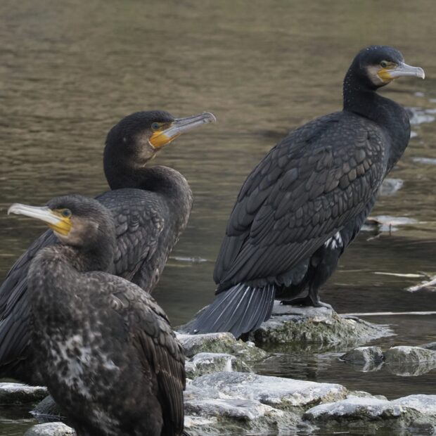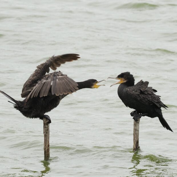 朝方に数羽から数百羽の群れを作り、 餌を採りにねぐらから飛び立ちます。 潜水して主に魚類を捕食します。 木や岩などの上に止まって羽を大きく広げ、 乾かします。 ウの仲間は潜水しやすいように、 水をはじかないような羽をしているため、 乾かす必要があります。