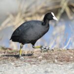 水の上を泳いでいることが多く、 冬は群れで生活します。 脚は弁足と呼ばれる形状になっていて、 水かきがあります。 くちばしと額は白く、 とても目立ちます。