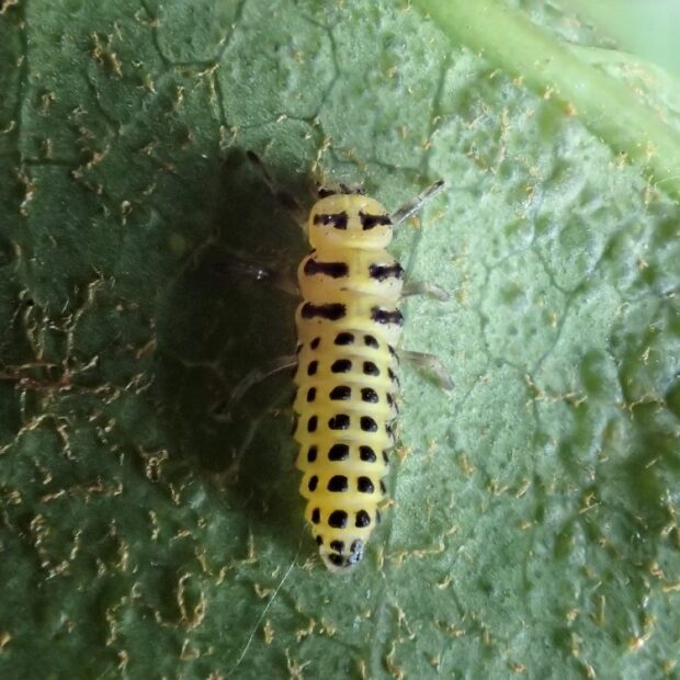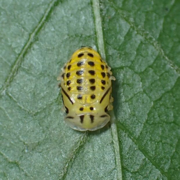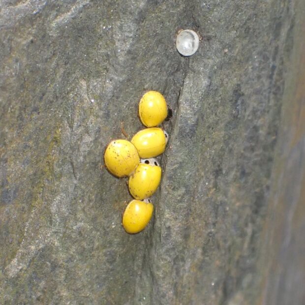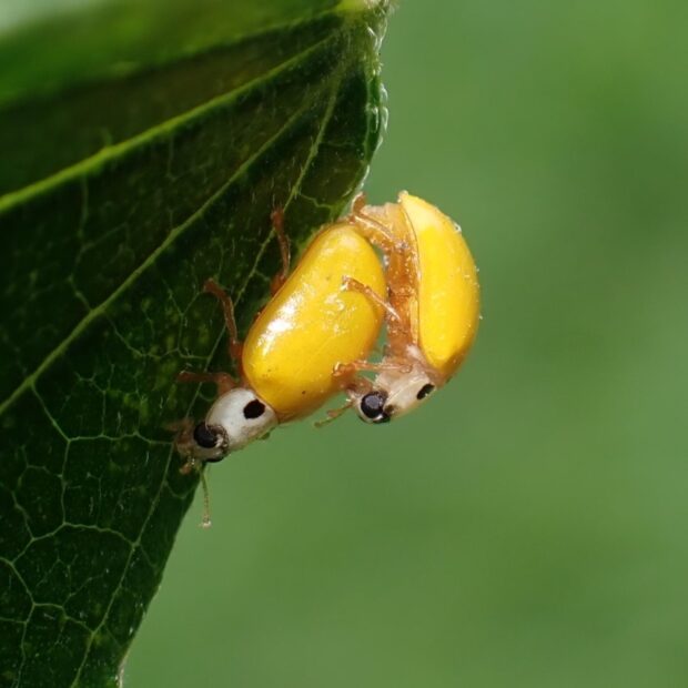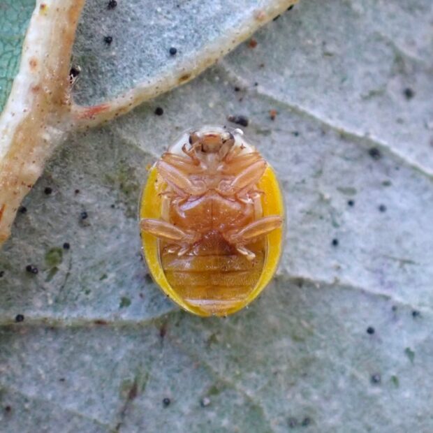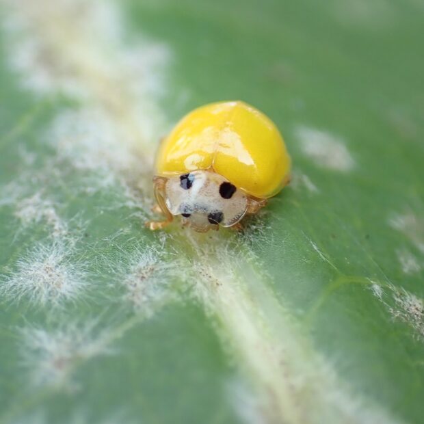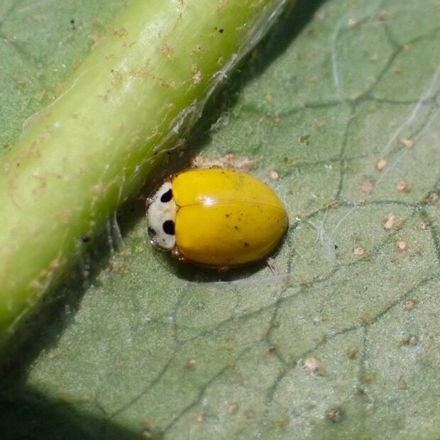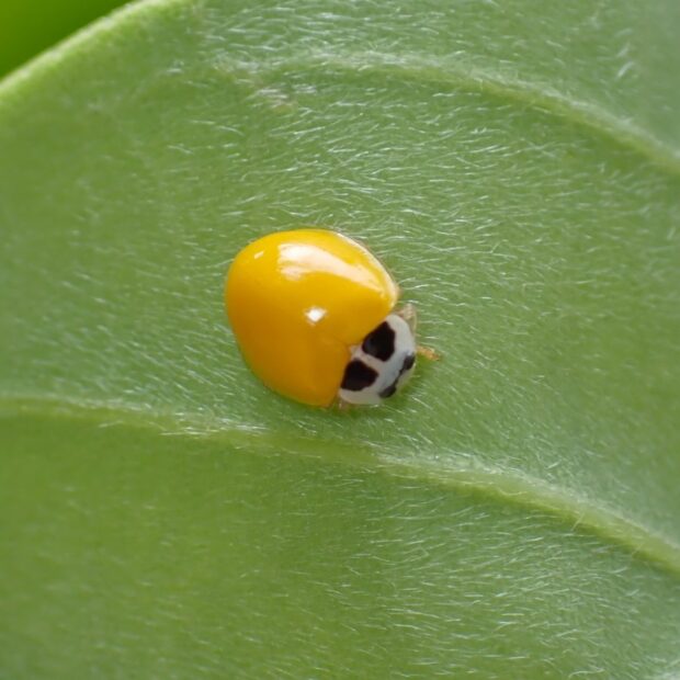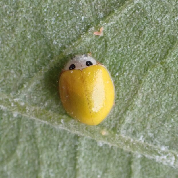 黄色い小さなテントウムシ。 つやのある鮮やかな黄色いはねが目立ちます。 幼虫・成虫ともに、 葉っぱの表面が白くなるうどんこ病などの菌類を食べます。 葉裏や落ち葉の中などで成虫越冬。
