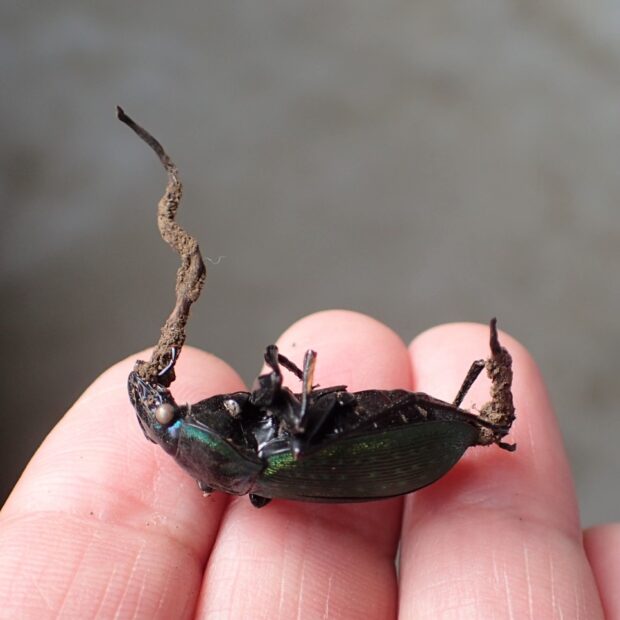 冬虫夏草の一種のオサムシタケが発生することがあります。 オサムシタケはオサムシ類の幼虫や成虫に寄生する菌類で、 梅雨時に湿った場所で見られます。