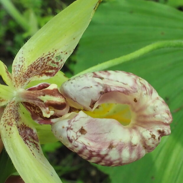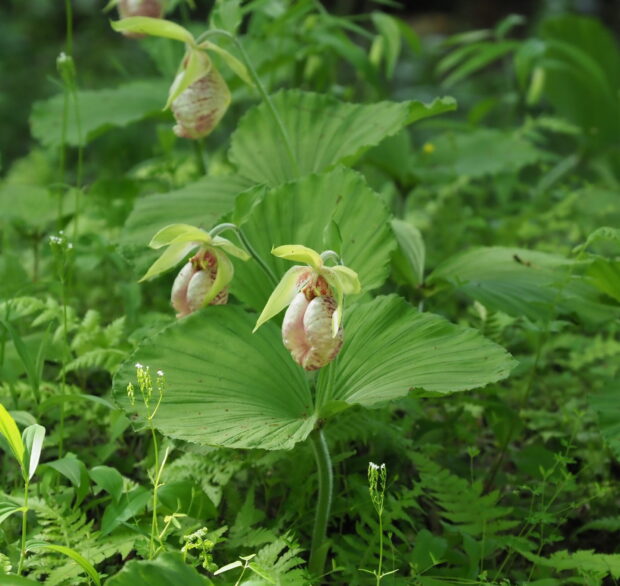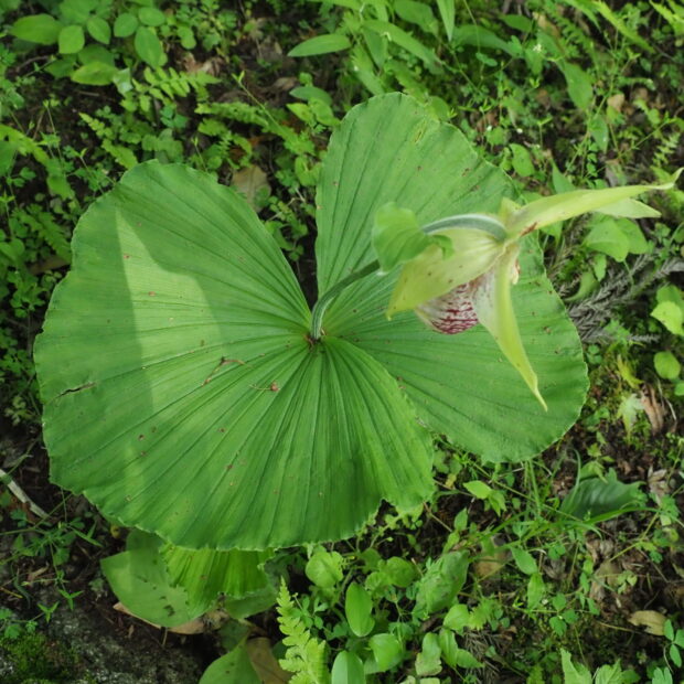 袋状になった花びらが、 源平一ノ谷の戦いで活躍した源氏方武将熊谷直実(くまがいなおざね)が流れ矢を防ぐために背負った布の袋(母衣、 ほろ)に喩えられ名前がつけられました。 直実に討たれた平敦盛の名をとった近縁種アツモリソウもあります。 葉は扇子のような面白い形をしています。