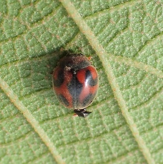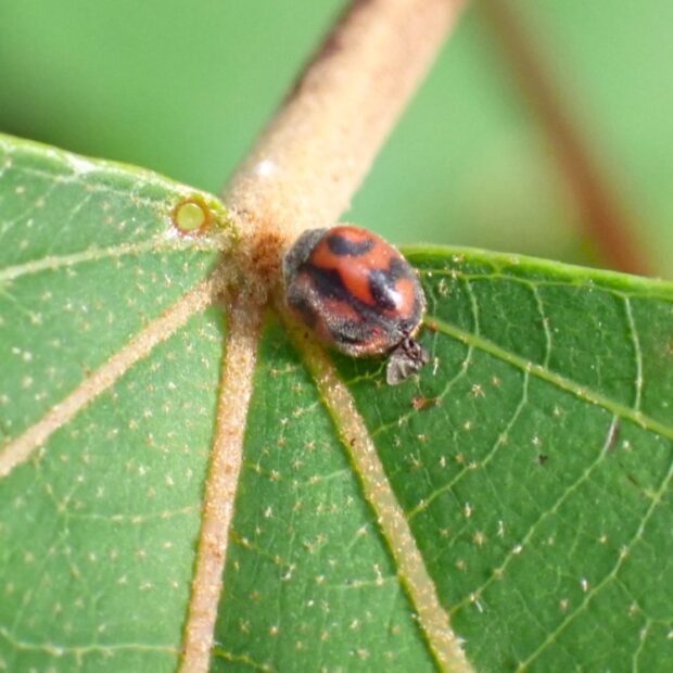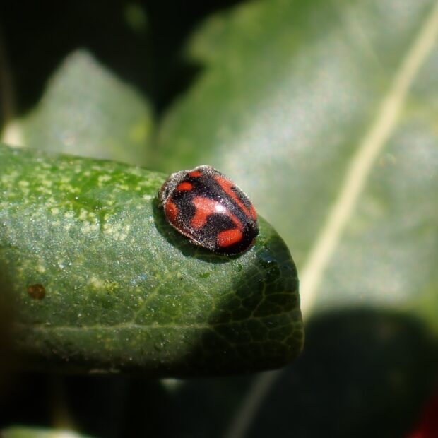 赤いはねに特徴のある黒い紋がある小さなテントウムシ。 1911年、 イセリアカイガラムシを駆除する目的で、 台湾から日本に導入されました。 べダリアテントウは、 一生のうちで200匹ほどのイセリアカイガラムシを食べると言われています。