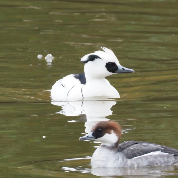 大きめな池や、 河川、 湖沼などで見られます。 オスの体色は白色で、 目の周りが黒いためパンダのように見えます。 メスは頭と首が茶色で、 顎と喉が白色です。 潜水しながら貝類を食べます。