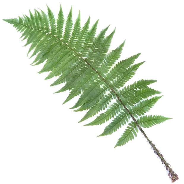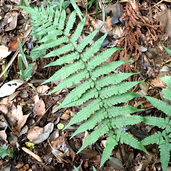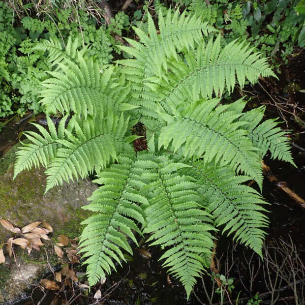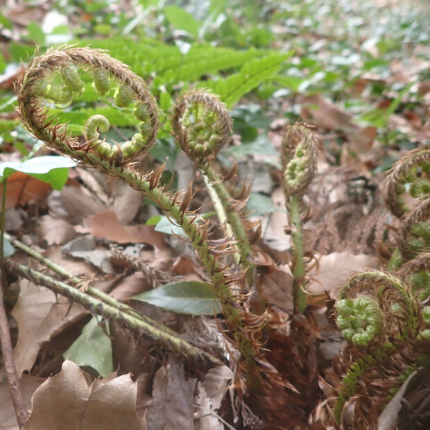 身近なタテ長のシダです。 葉柄に鱗片がたくさんつき、 近縁種のクマワラビよりもこの鱗片が黒っぽいことから雄クマワラビと名付けられました。 とはいえ株によっては茶色っぽいこともあります。