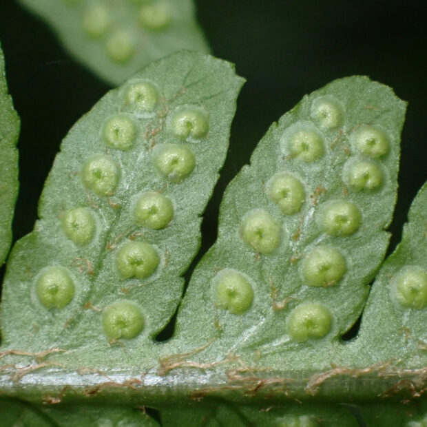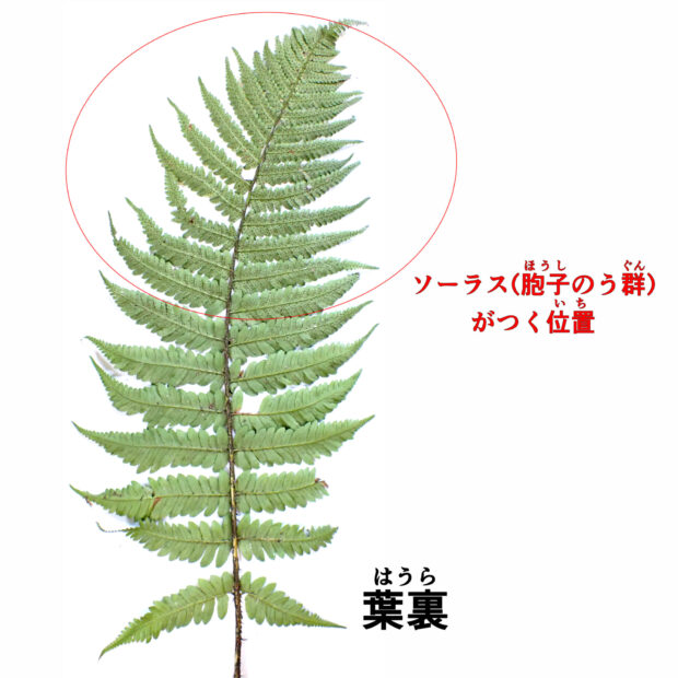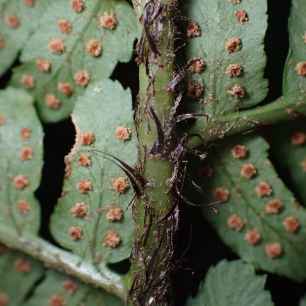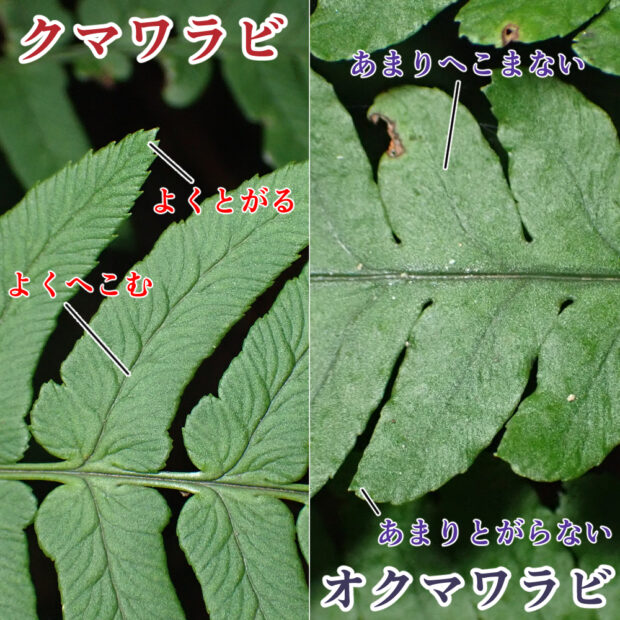 ●クマワラビは①胞子のう群のつく部分がよく縮み、 ②小さな切れ込み(小羽片)先はよく尖り、 ③葉脈はよく凹み、 ④鱗片は茶色っぽいことなどが特徴です。