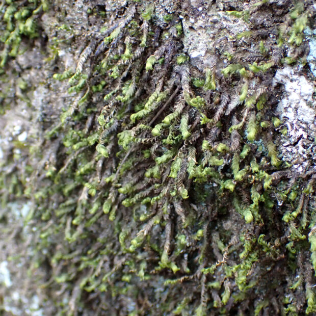林内に多い身近なホウオウゴケの仲間。 葉先付近のフチに肉眼では見えないほどの小さなギザギザ(鋸歯)があり、 これがニワトリの鶏冠(とさか)に例えられました。