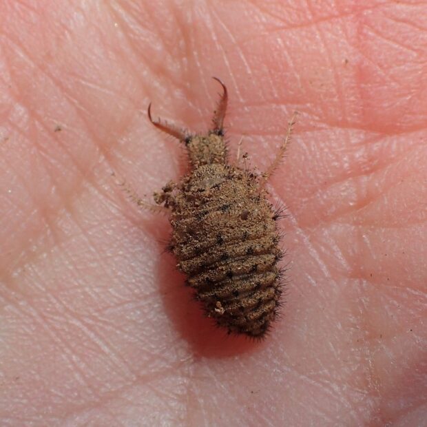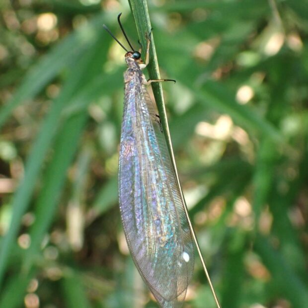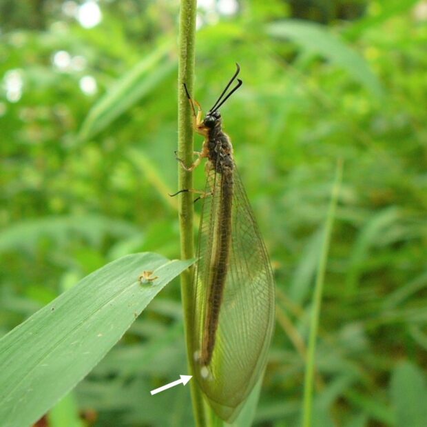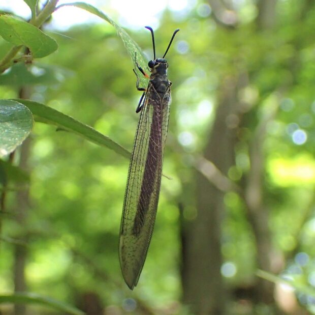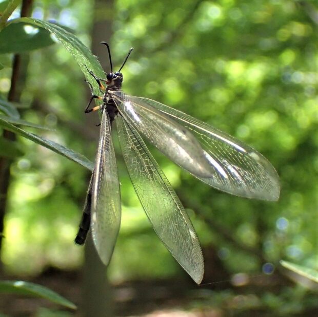 平地から山まで、 やや薄暗いところで見られます。 トンボに似ていますが、 はねを伏せてたたみ、 触角がやや長く、 弱々しく飛びます。 「アリジゴク」として知られる幼虫は、 空腹と乾燥に強く、 1~3年かけて成虫なります。