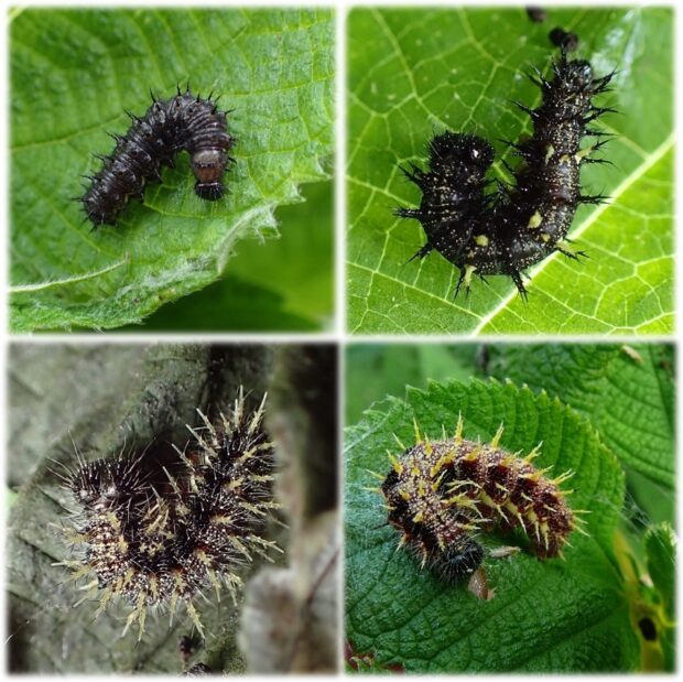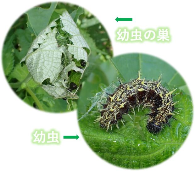 • 幼虫は小さいときは黒い。 トゲトゲがいっぱいで、 大きくなるとトゲが黄色っぽくなる。