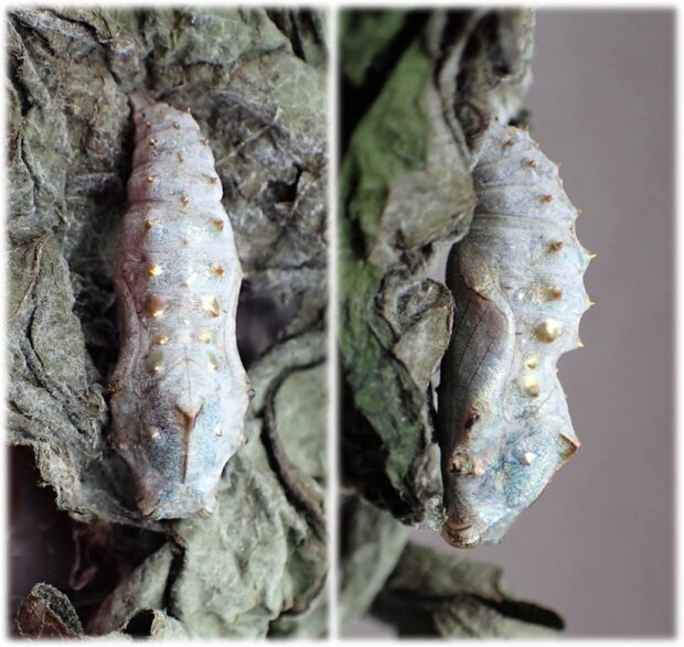 • 白っぽく輝く蛹。 突起は金色。