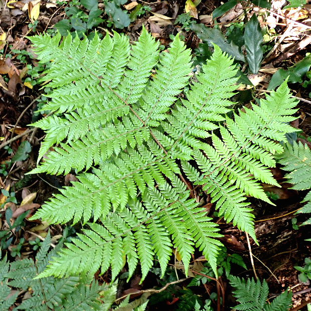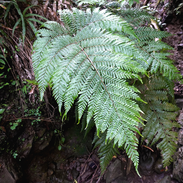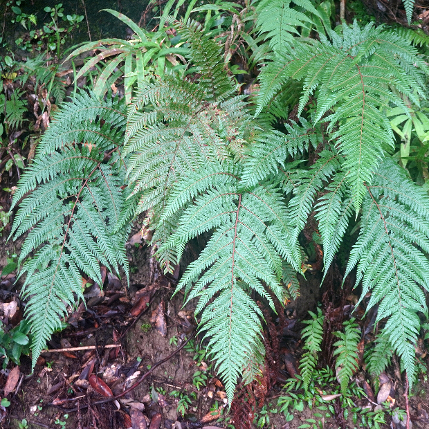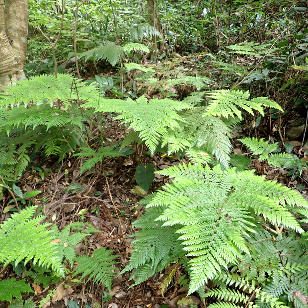カツモウイノデとともに琉球以南には、 タカワラビ科のタカワラビというシダが分布しています。 いずれも園芸植物として割とメジャーで、 金色が幸運を呼ぶとかの名目で高値でよく売られています。 (ちなみに、 沖縄に行けばどちらも普通に見られます…)