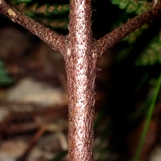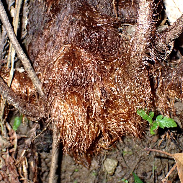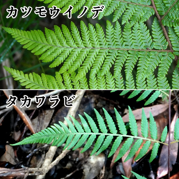 タカワラビは葉柄基部に金色っぽい毛をたくさんつけ、 この特徴から園芸ではキンモウコウ(中国名の金毛狗蕨が由来)とよく呼ばれています。 それゆえにカツモウイノデとよく混同されてしまっていて、 園芸ショップでカツモウイノデがタカワラビという名で売られてしまうことがあるほどです。 ですが、 タカワラビは木生シダで有名なヘゴ科に近い仲間。 カツモウイノデとは全く別のグループのシダで、 知っていれば見分けるのは簡単です。
