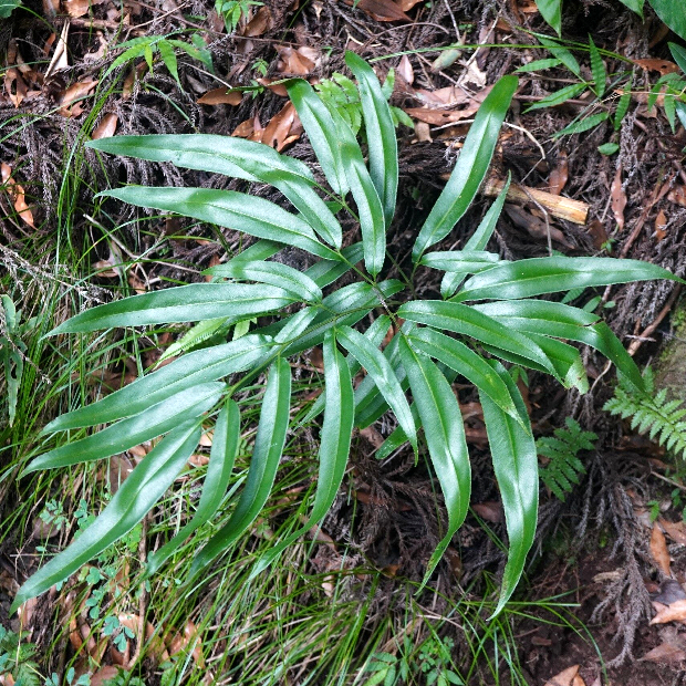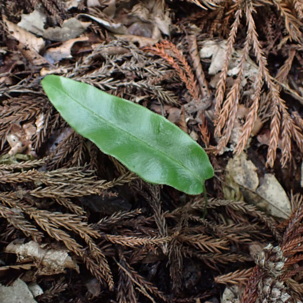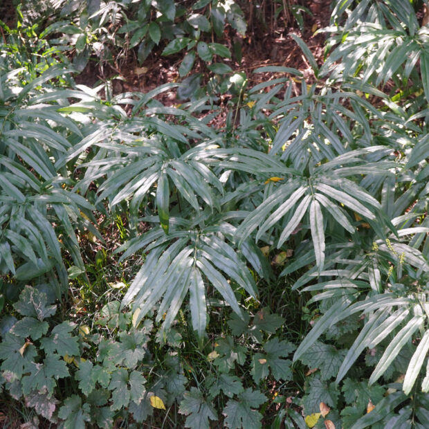 低地の林内でよく見られる巨大なシダの1つ。 葉は濃い緑色で、 切れ込み方はシダというよりは単子葉類っぽいところがあります。 名前のイワガネは岩のすき間からよく生えている的な意味がありますが、 地上から生えていることが多いです。