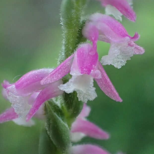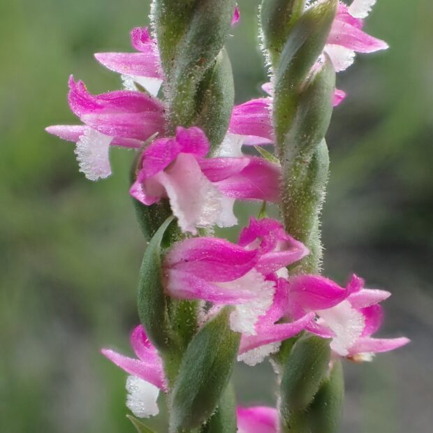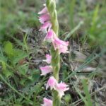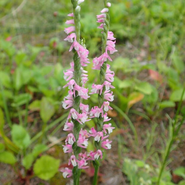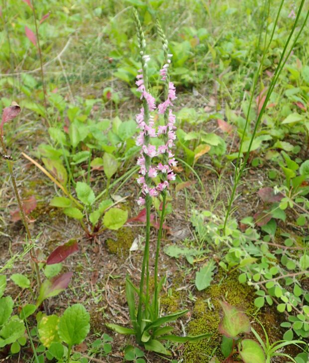 細長い花穂に小さな桃色(ピンク)の花がねじれるように並んで咲くことから、 ネジバナと名がつきました。 別名ネジリバナ、 モジズリもねじれていることから。