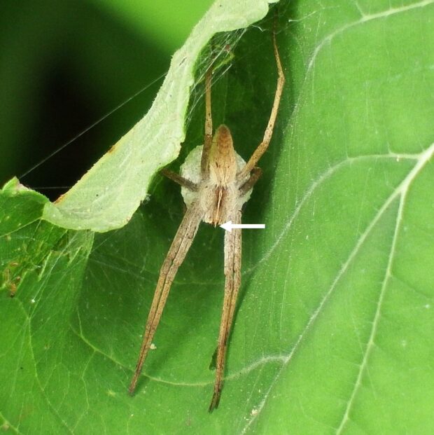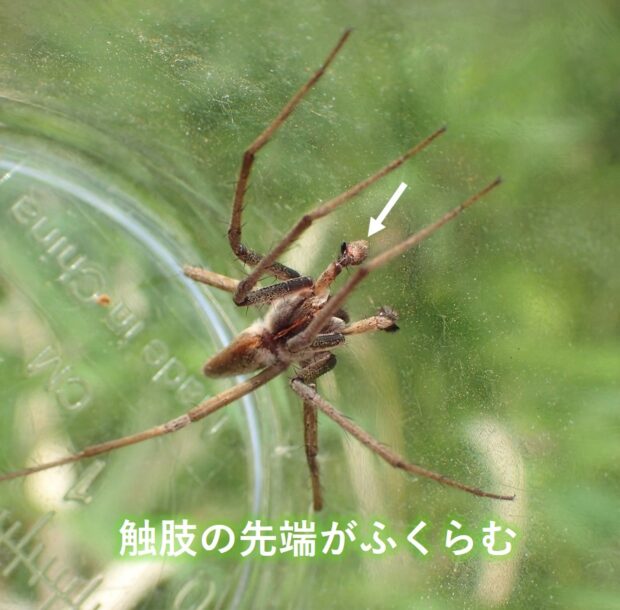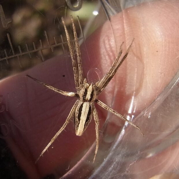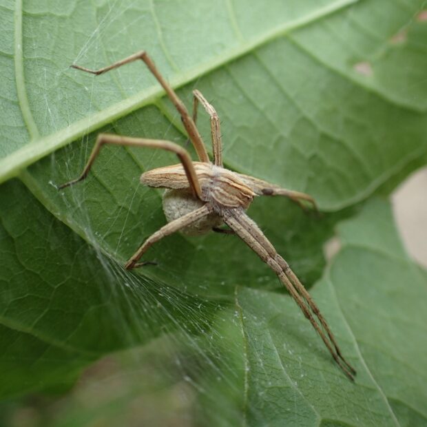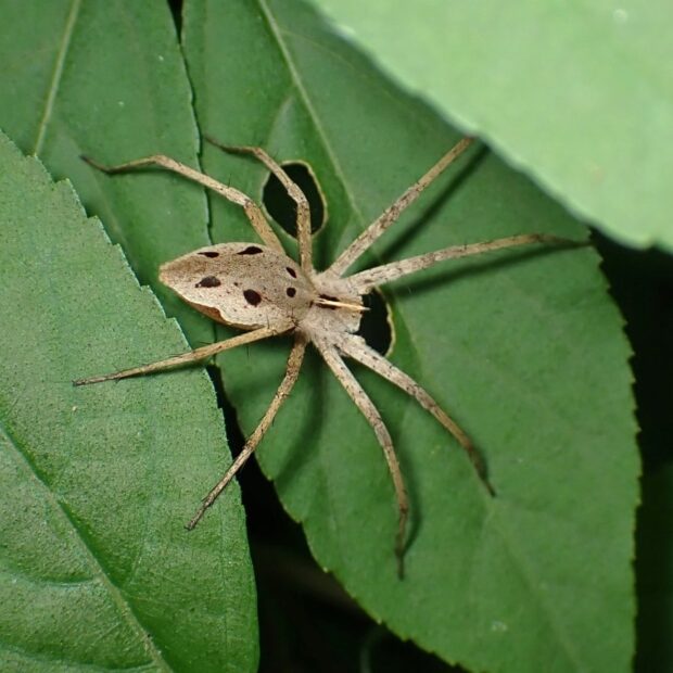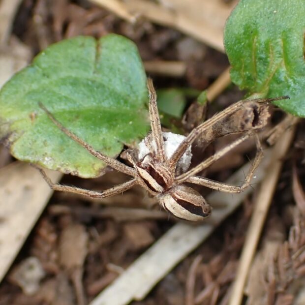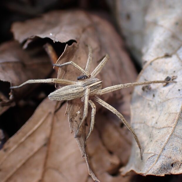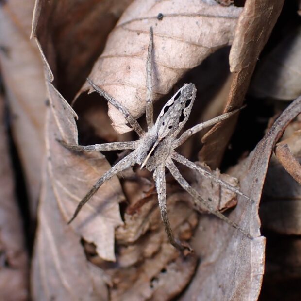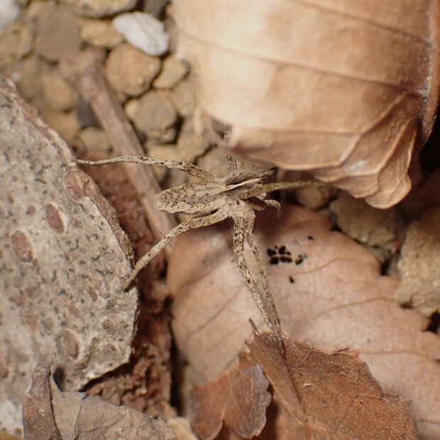 網を張らず歩き回って獲物を探すキシダグモの仲間。 頭胸部の先端がとがるのが特徴で、 色や模様はいろいろです。 クモとしては珍しく、 オスはメスに糸で包んだ獲物をプレゼントし、 メスがその獲物を食べている間に交接をします。 成体は初夏に姿をあらわします。
