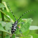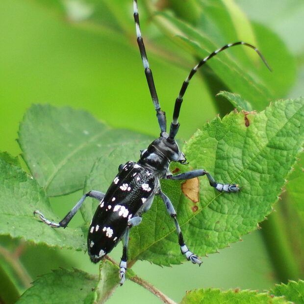 光沢のある黒い上翅(じょうし)に白い点々があるカミキリムシ。 雑木林の他、 街中の公園や庭などで普通に見られます。 幼虫はさまざまな生きている木の内部を食べ、 2年目に成熟します(2年1世代)。 成虫は若い枝の皮をかじって食べます。