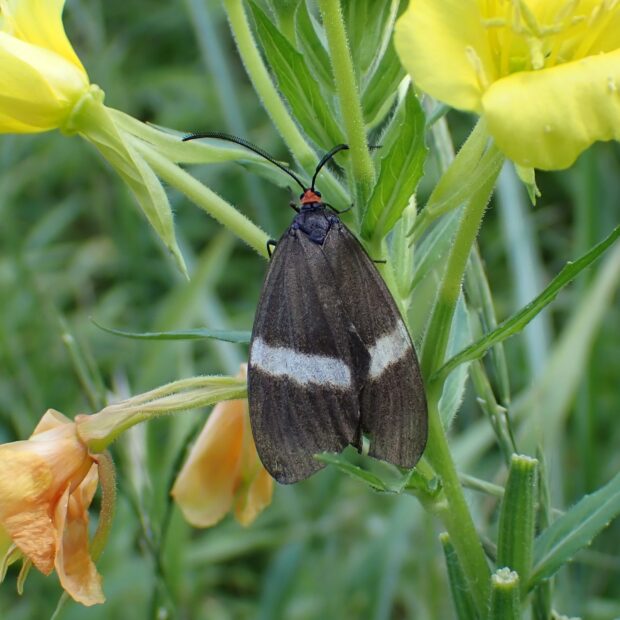 頭が赤く、 はねが黒いところがホタルに似ており、 後ばねに白い部分があることから、 シロシタホタルガと名づけられました。 サワフタギの木のある雑木林などで見られます。 若い幼虫で越冬します。 (MT)