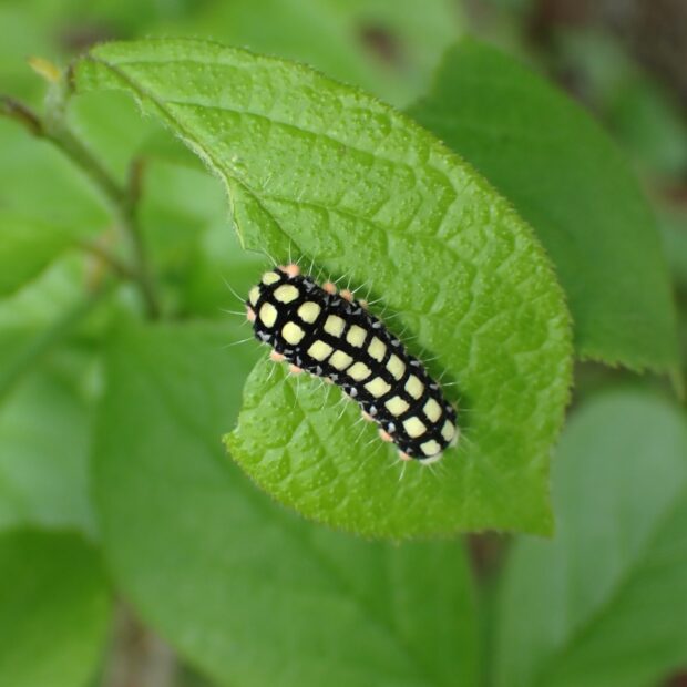 • サワフタギの葉を食べる幼虫。