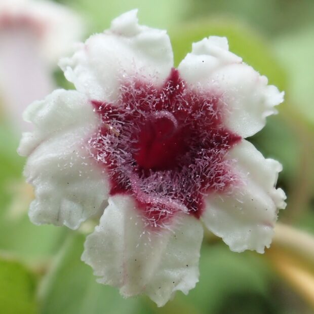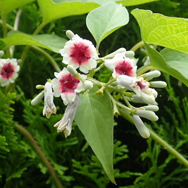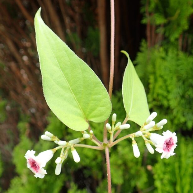 市街地や人家、 山野などどこでも見られるつる性の植物です。 中心部が赤紅色の白い花を夏に咲かせます。