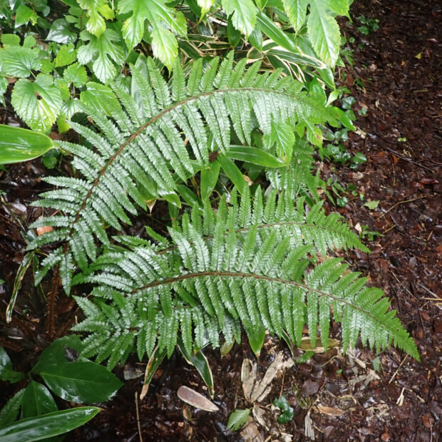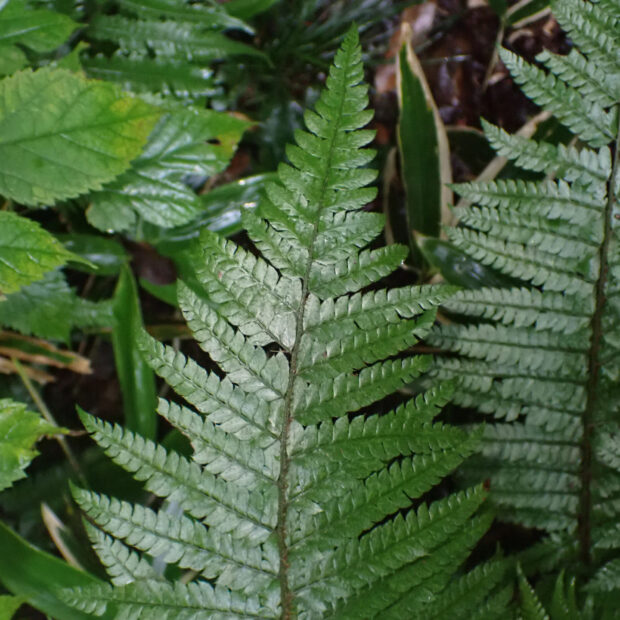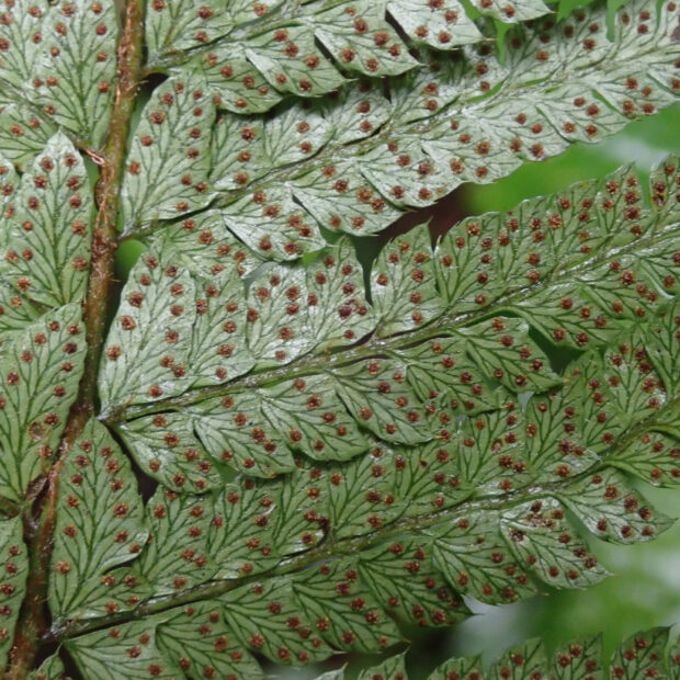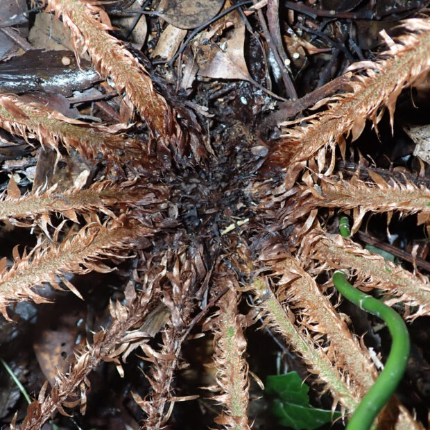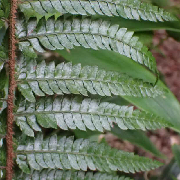 葉柄基部の鱗片。 中央が栗色の鱗片が混じる。