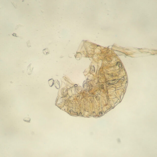 1つの胞子のう群を壊したもの。 この個体のほとんどの胞子のう群中の胞子は正常に発達していなかった。