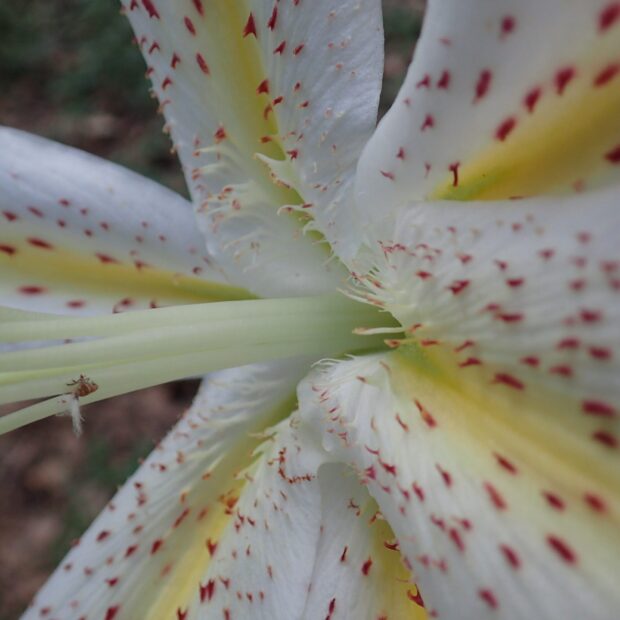 花被片(花びらとがく、 同じ色で同じ大きさ)は6枚で白く大きく、 中央に黄色い筋があり、 赤色の斑点があります。