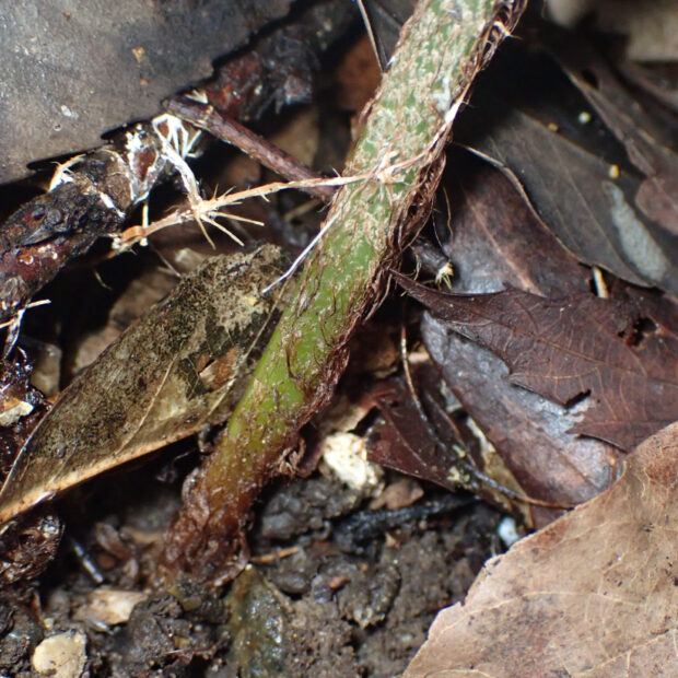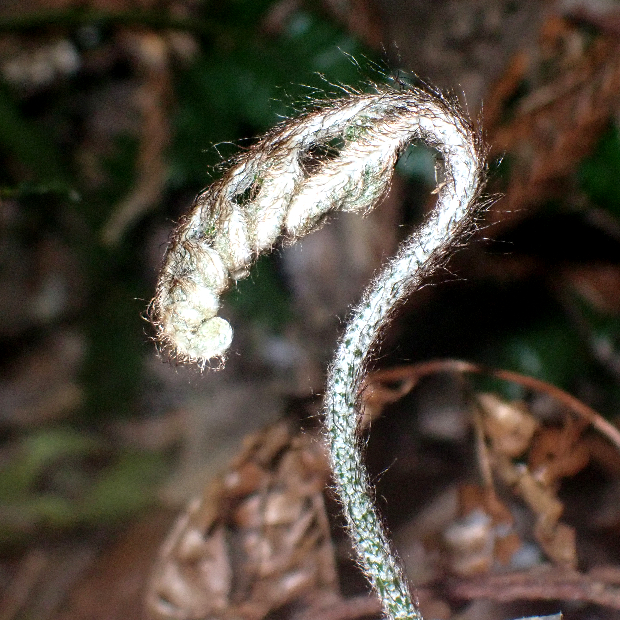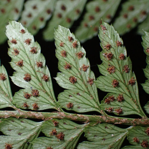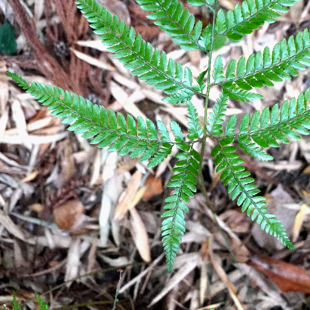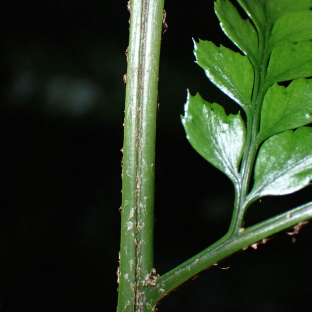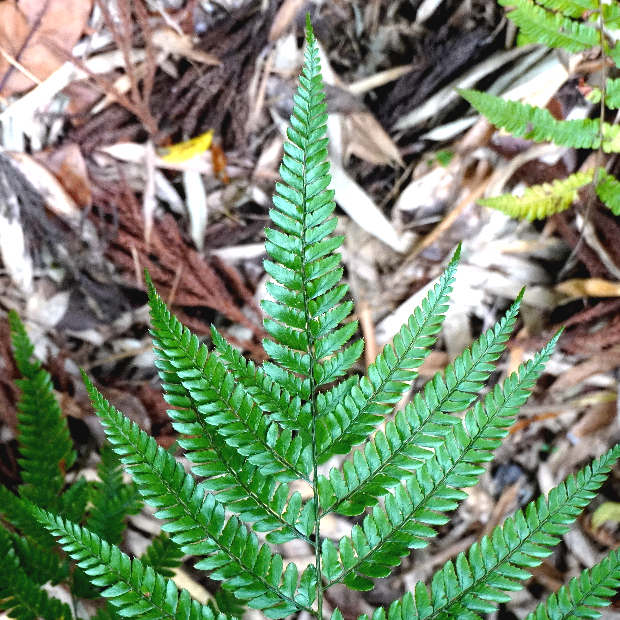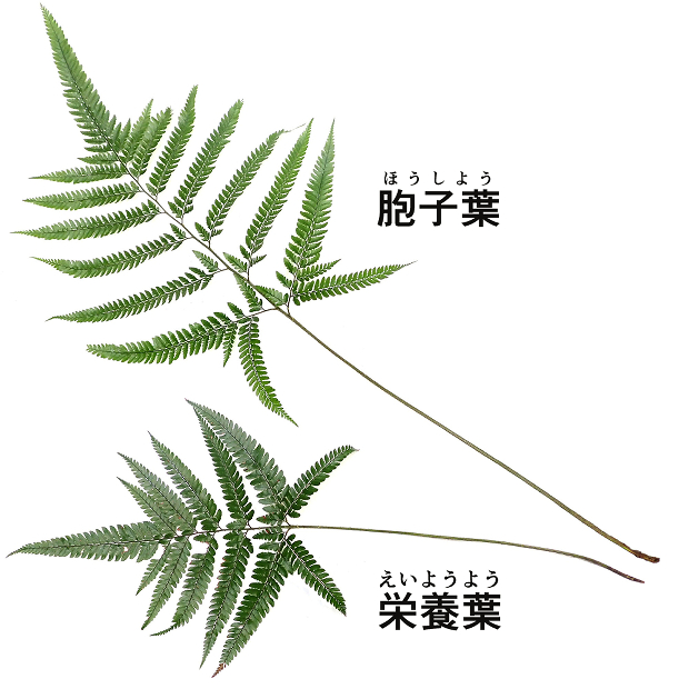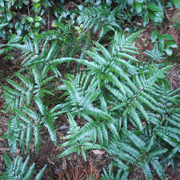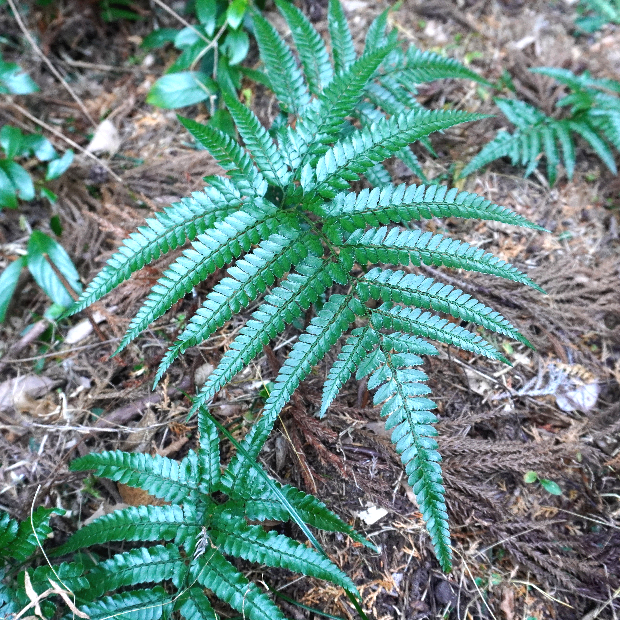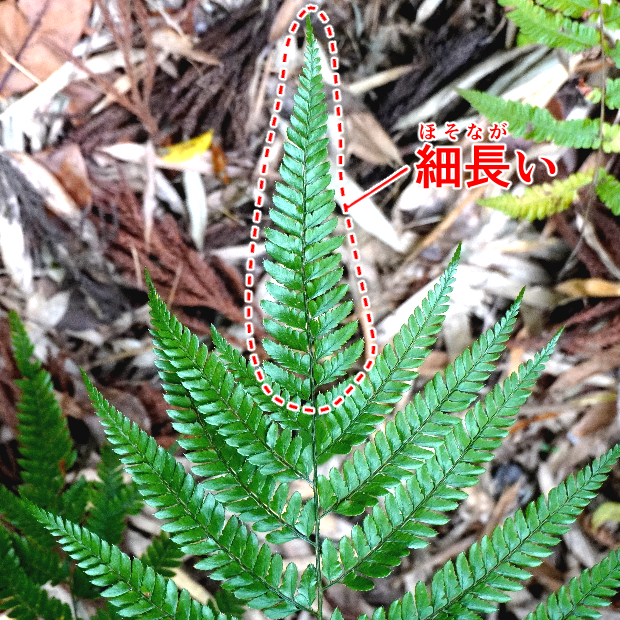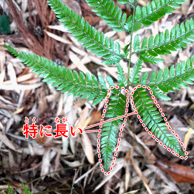暖かい地域の海岸近くの林内によく群生するシダ。 葉は金属のようにテカテカしていて、 上に1つと下に2つの三方向に細く伸びる葉が特徴的です。 近い仲間とは雑種をよく作ります。