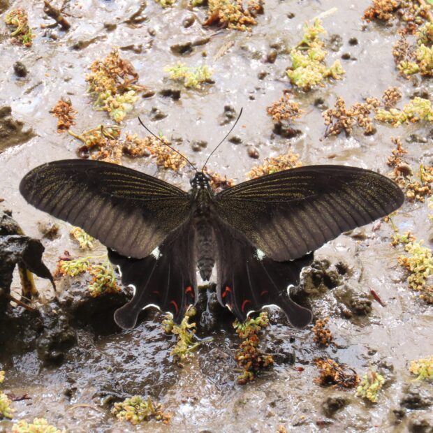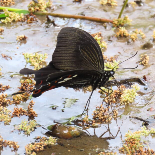 後ばねに大きなクリーム色の紋がある大きなアゲハチョウ。 いろいろな花を訪れ、 地面で給水します。 南方系で、 林縁やミカン類の栽培地など暖かい地域でよく見られます。
