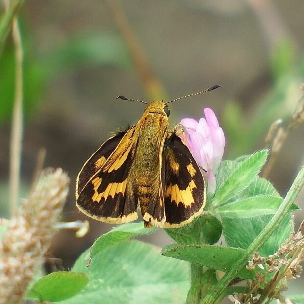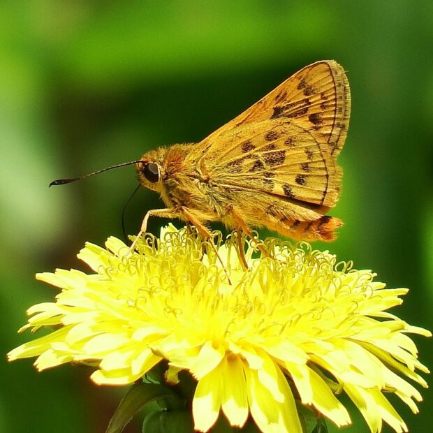 黄色っぽい裏ばねに茶褐色のまだら模様があるセセリチョウ。 敏速に飛び、 いろいろな花を訪れ、 地面で給水も行います。 林縁、 草地、 河川敷など日当たりのいい場所で見られ、 街中ではあまり見られません。 幼虫越冬。 (MT)