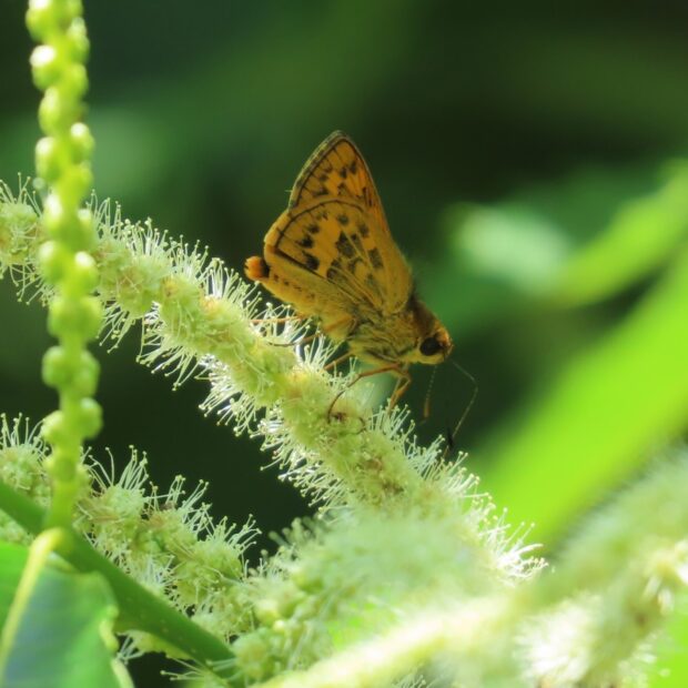 黄色っぽい裏ばねに茶褐色のまだら模様があるセセリチョウ。 敏速に飛び、 いろいろな花を訪れ、 地面で給水も行います。 林縁、 草地、 河川敷など日当たりのいい場所で見られます。 幼虫越冬。