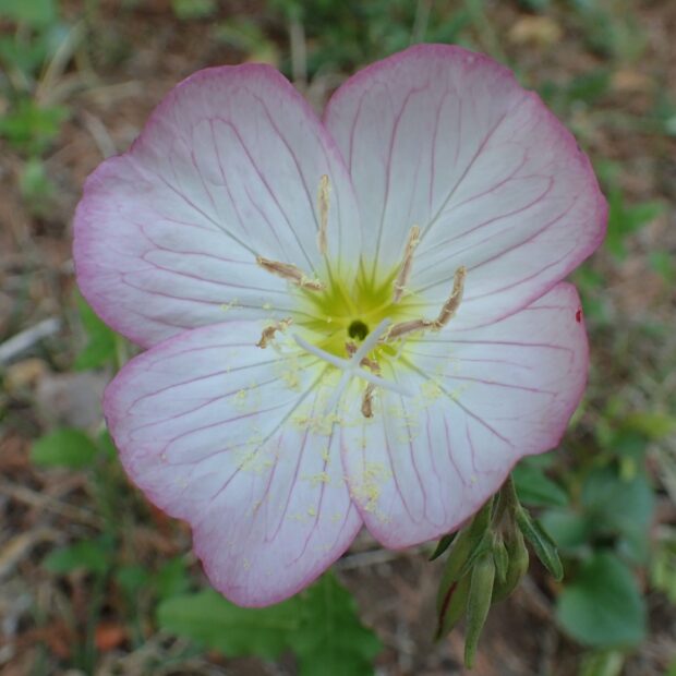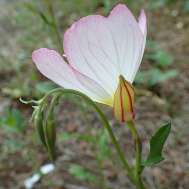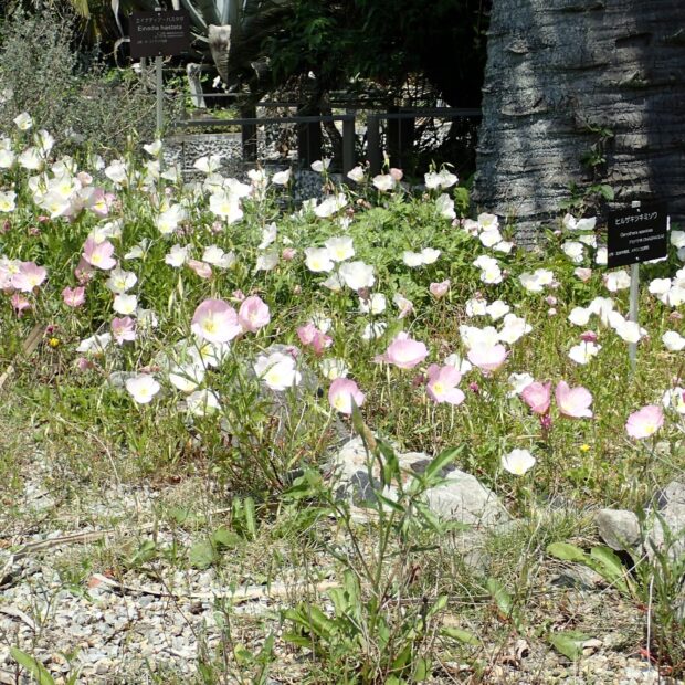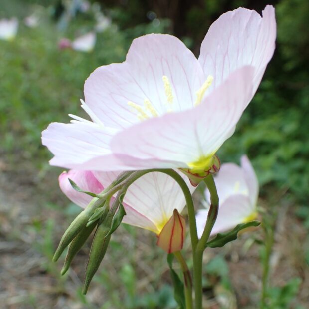 月見草はマツヨイグサ属の植物全般を指す呼び名で、 多くの種が夕方咲いて朝にはしぼむ中で、 日中も咲いているので、 昼咲月見草(ヒルザキツキミソウ)と名付けられました。 淡いピンクの花がきれいで、 鑑賞用に導入され栽培もされており、 野生化も各所で見られます。