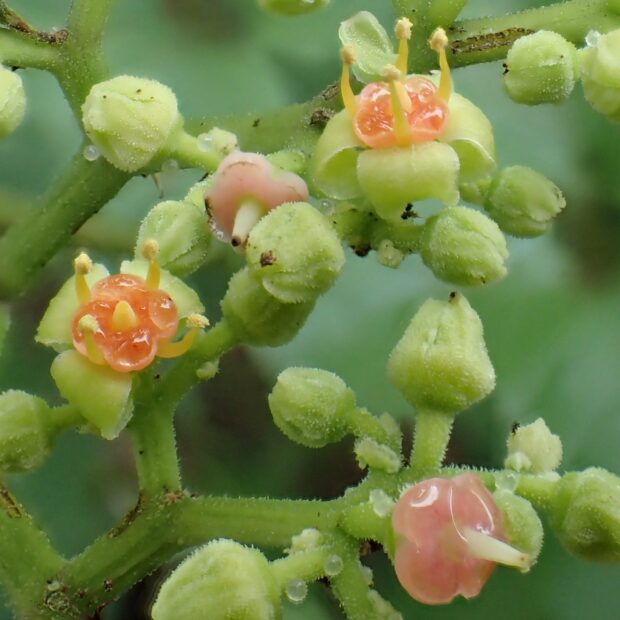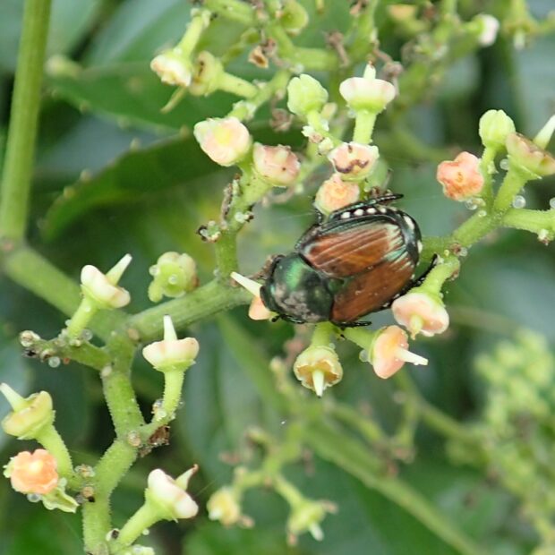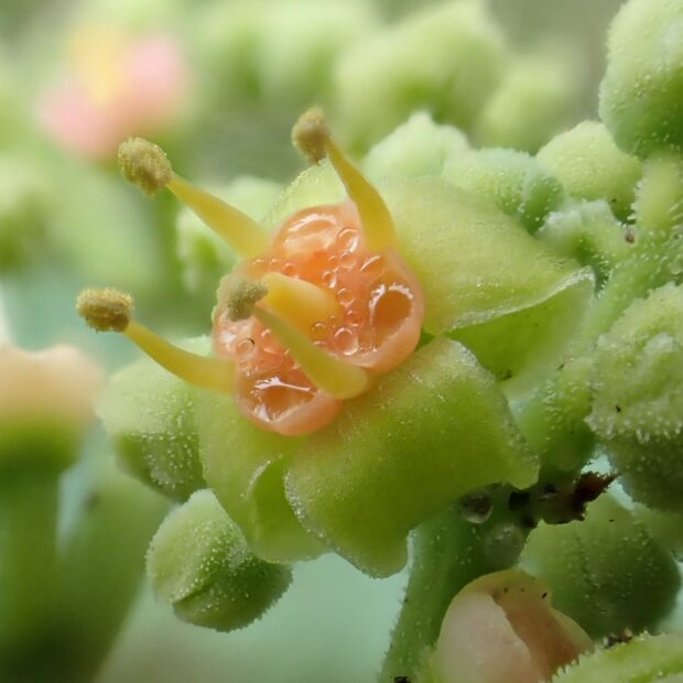 花のオレンジ色の部分に蜜が出てきて、 昆虫を引きつけます。
