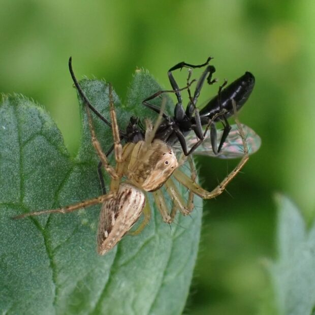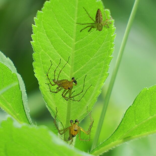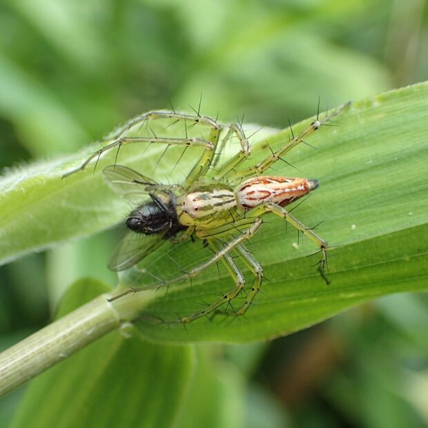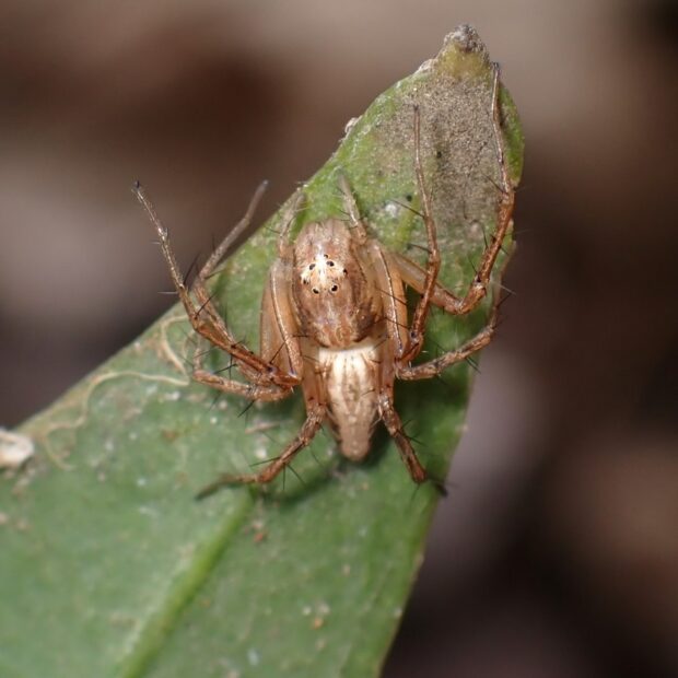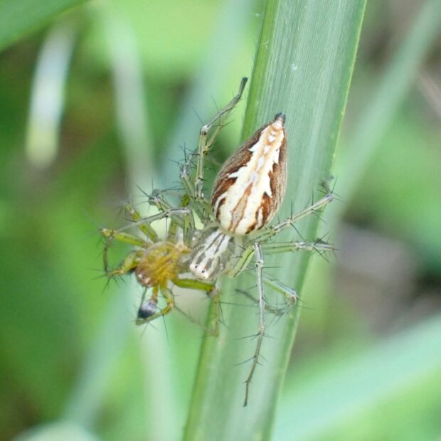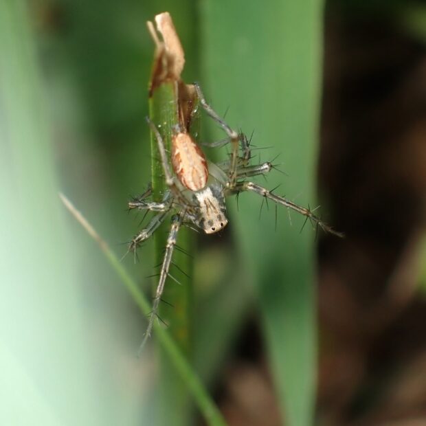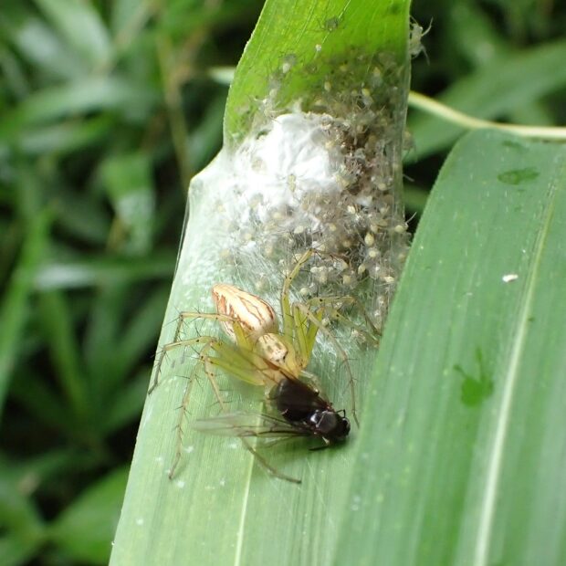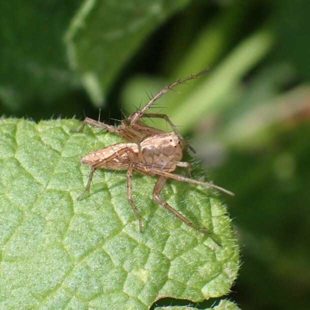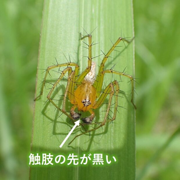 ササグモの仲間。 網は張らず、 葉の上で、 前あしを広げ獲物が近づくのを待ち、 獲物が来ると飛びついてとらえます。 あしにたくさんの毛がはえており、 腹部はほっそりしています。 草地、 公園、 庭などで普通に見られます。