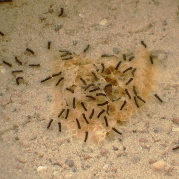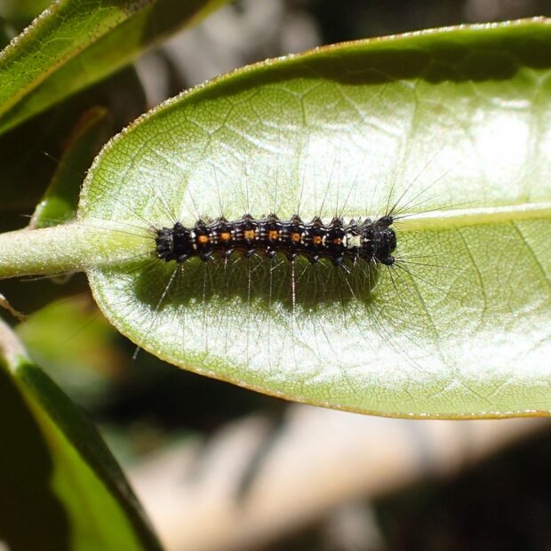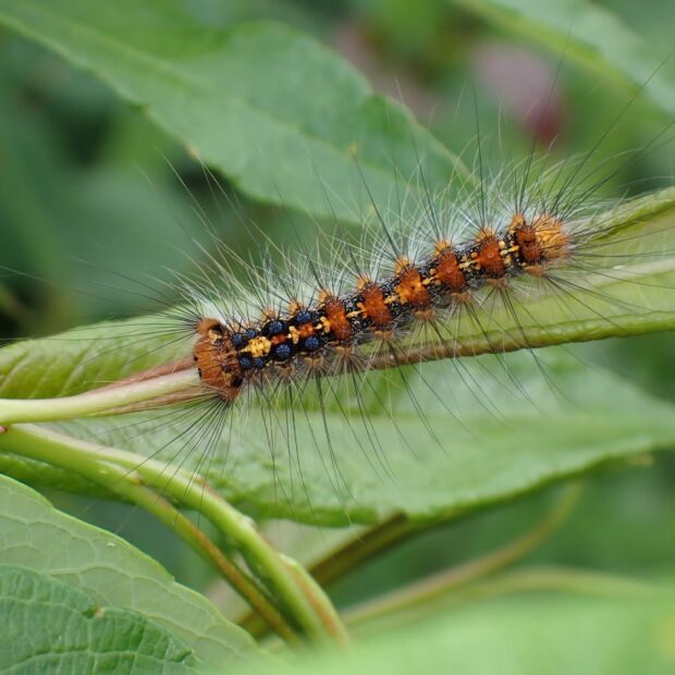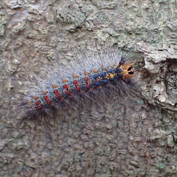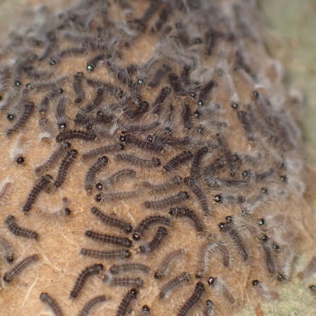 ドクガの仲間ですが、 毒があるのは1齢幼虫だけです。 1齢幼虫には毒針毛(どくしんもう)があり、 さわると皮膚炎になりますので、 さわらないよう注意してください。 卵、 2齢幼虫以降の幼虫、 繭、 成虫には毒はありません。