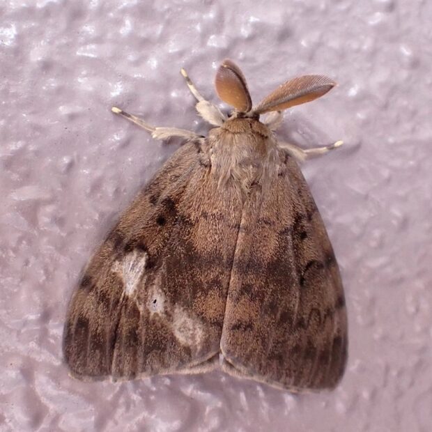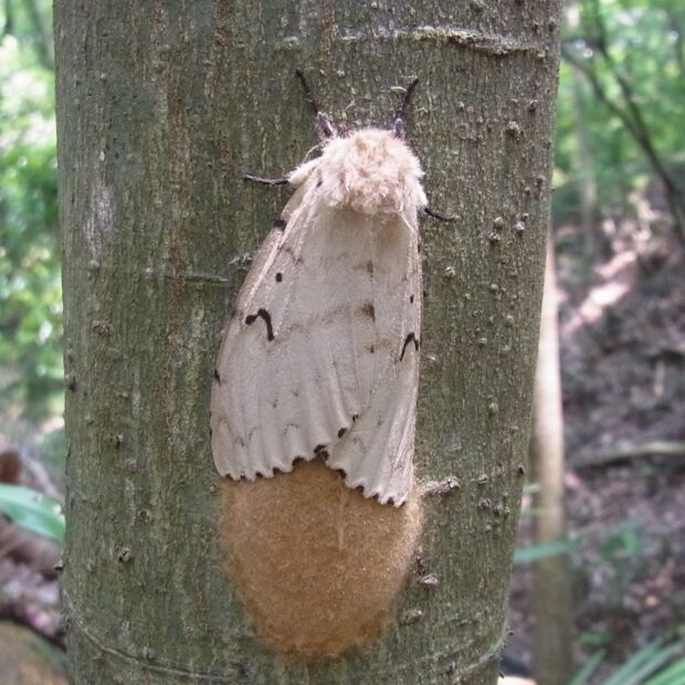 ドクガの仲間。 オスは飛びまわりますが、 メスはあまり飛ぶことはなく、 木の幹などでじっとしています。 大発生を繰り返し、 幼虫はさまざまな葉を食べつくします。 オスがひらひら飛び回る姿から「舞舞蛾」と名づけられました。