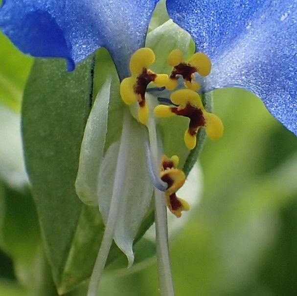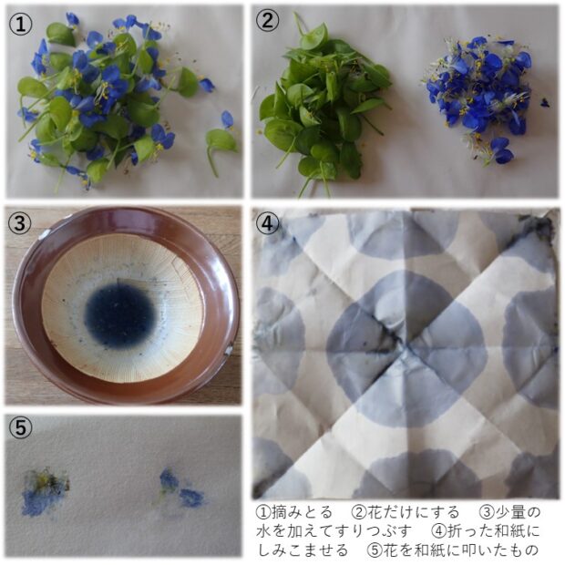 花びらの青い色素は水で流され消えるので、 友禅染などの下絵を描くのに使われました。 今でも花が大きな品種オオボウシバナが栽培され、 この花びらの色を絞って青紙にしみこませて保存し、 下絵描きに使っています。