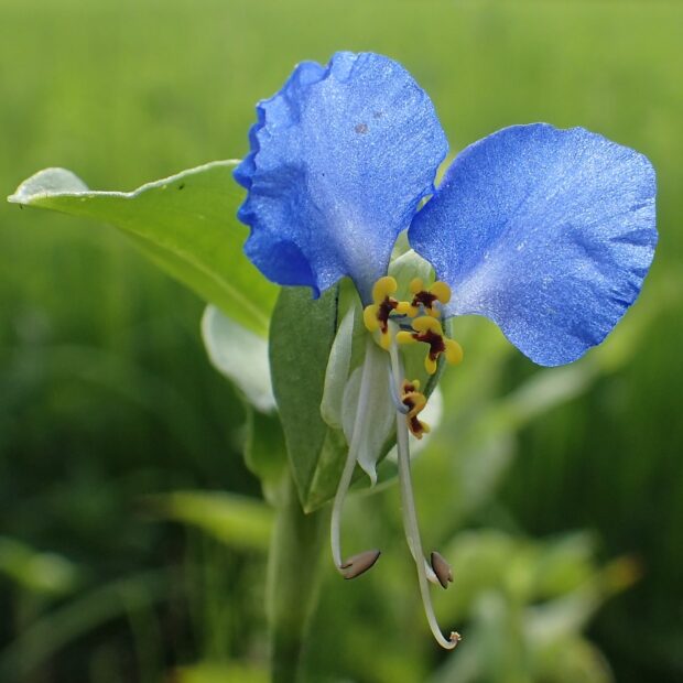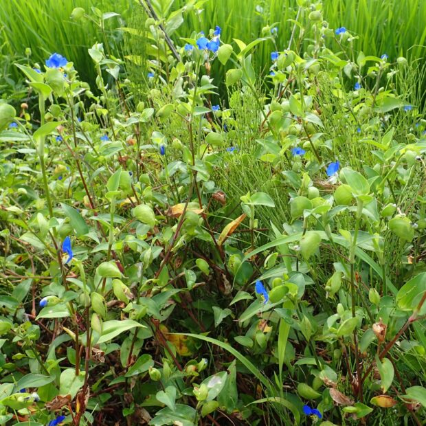 ツユクサ(露草)は、 青い花で衣服に色をつけたことから、 古くはツキクサ(着き草)と呼ばれ、 万葉集にも出てきます。 また、 アオバナ、 ウツシバナ、 ボウシバナなど多くの別名があり、 古くから親しまれてきた夏の花です。