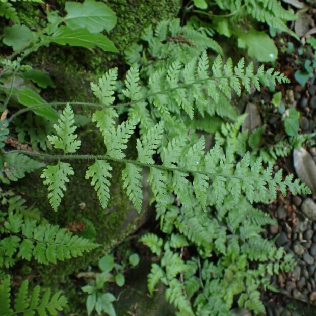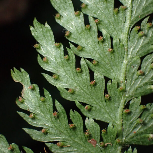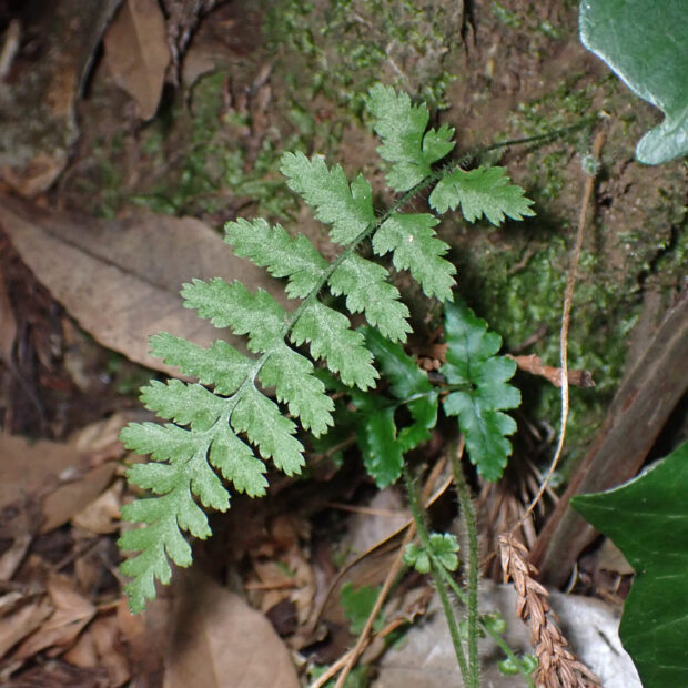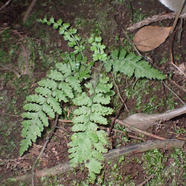 山地の斜面によく見られるシダです。 全体長い毛が多くてフサフサすることが特徴で、 和名はこれが犬に例えられたとする説があります。 シダとしては小さめなので、 あまり目立ちません。