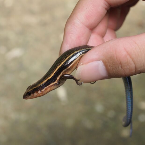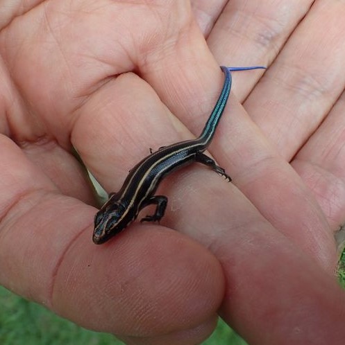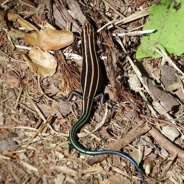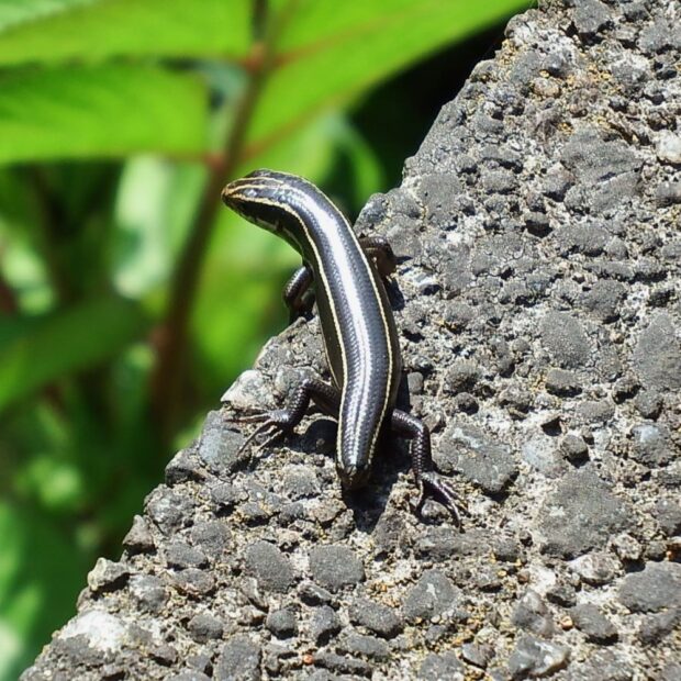 山地から人家の庭まで、 日当たりのいい所で見られます。 危険を感じると自ら尾を切り(自切)ます。 尾は再生しますが、 元通りの骨は形成されません。 西日本に生息するニホントカゲと姿はほとんど変わりませんが、 遺伝子が違い別種になります。 都市近郊では減少しています。