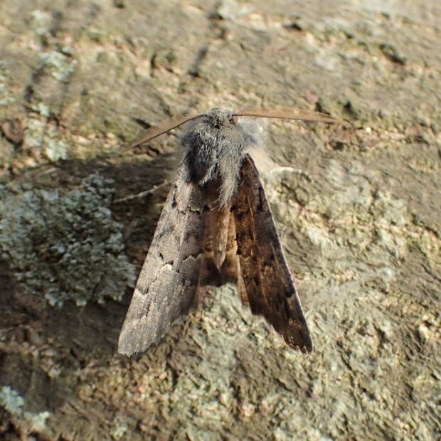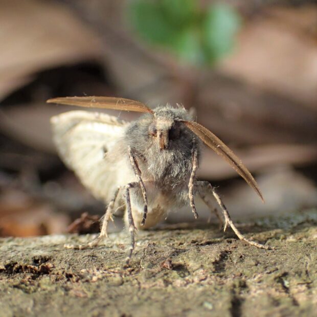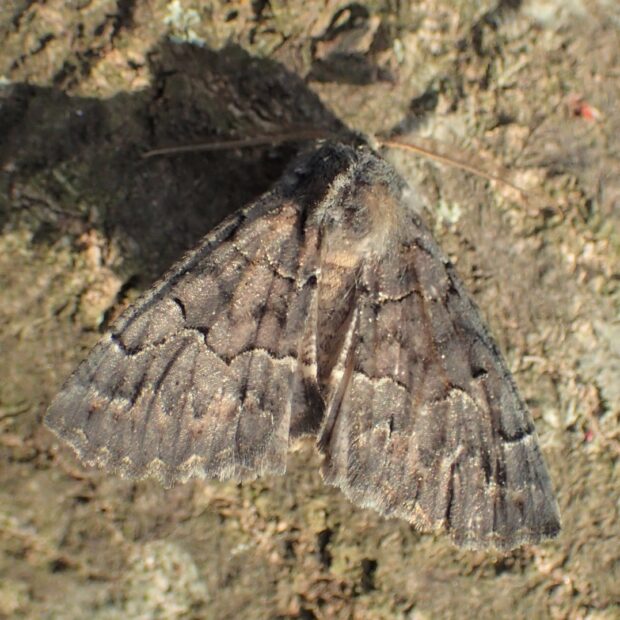 春のガ。 市街地の公園などで普通に見られ、 夜、 明かりによくやって来ます。 はねに線がはいっており、 シワっぽく見えますが、 光が当たるとキラキラ輝きます。 (MT)
