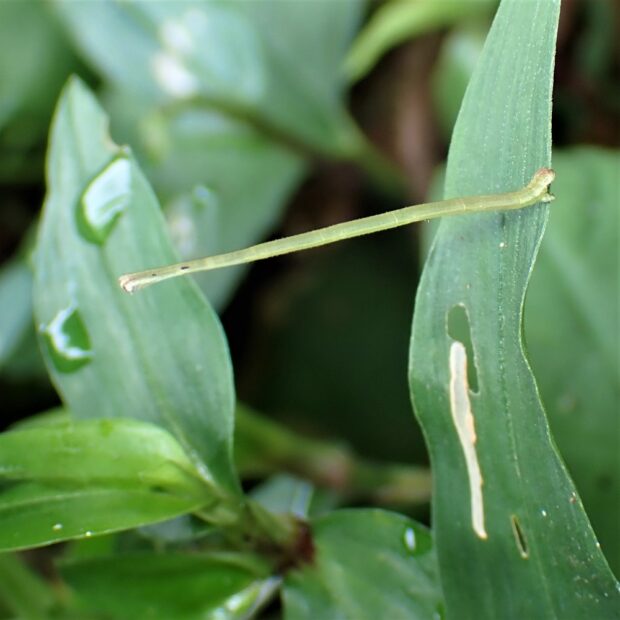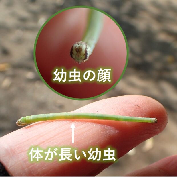 • 幼虫の体は長く、 ひものようなシャクトリムシ。