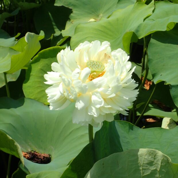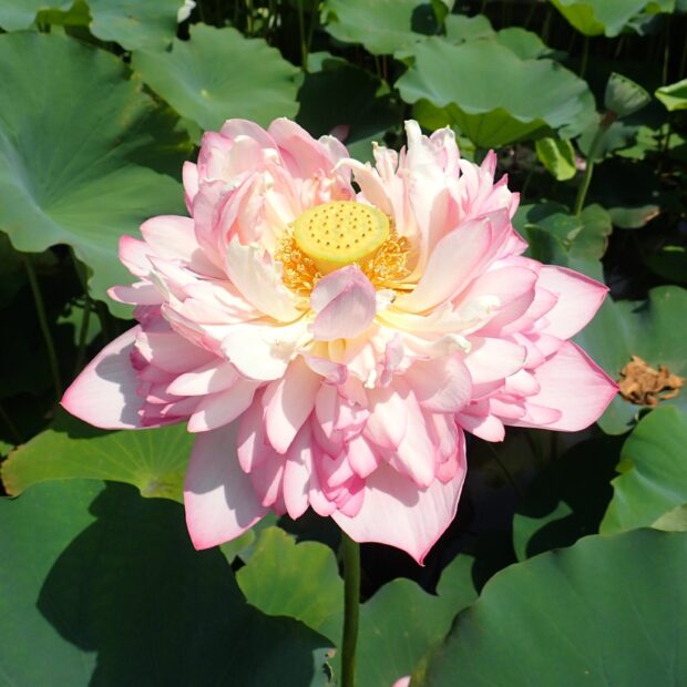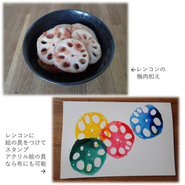 ユニークなレンコンの輪切りをスタンプがわりに使うのも楽しいです。 種子が落ちたあとの蜂の巣状の実は、 乾燥したものを花材や飾物づくりに活用できます。
