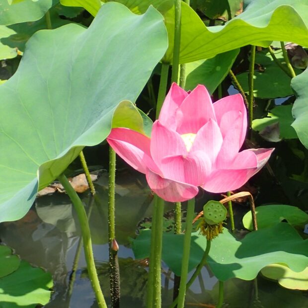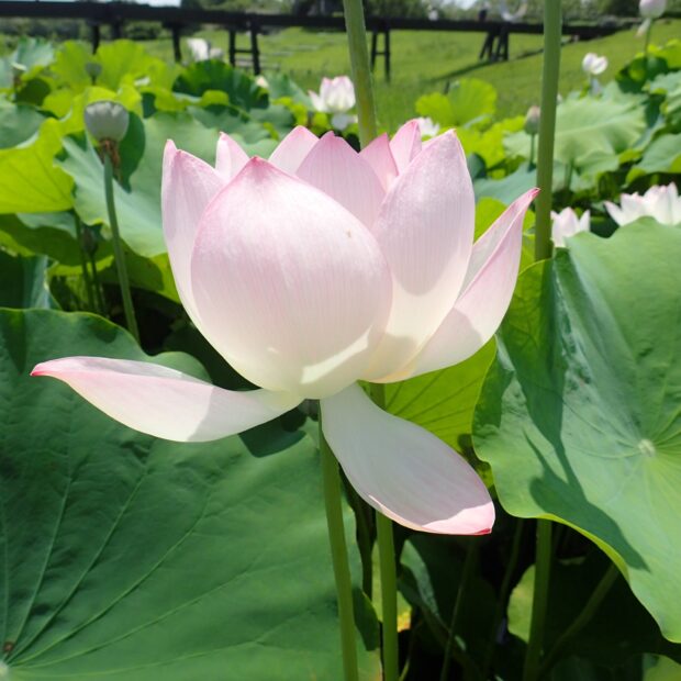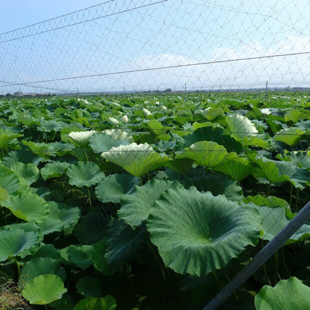 インド原産で古い時代に仏教とともに中国から伝わったと言われています。 池などに観賞用として植えられるほか、 根茎の蓮根(レンコン)を田んぼで栽培しています。 タネの寿命はたいへん長く、 遺跡や古い地層から出てきたハスのタネが発芽して現在によみがえった事例があり、 オオガハスが有名です。 (HT)