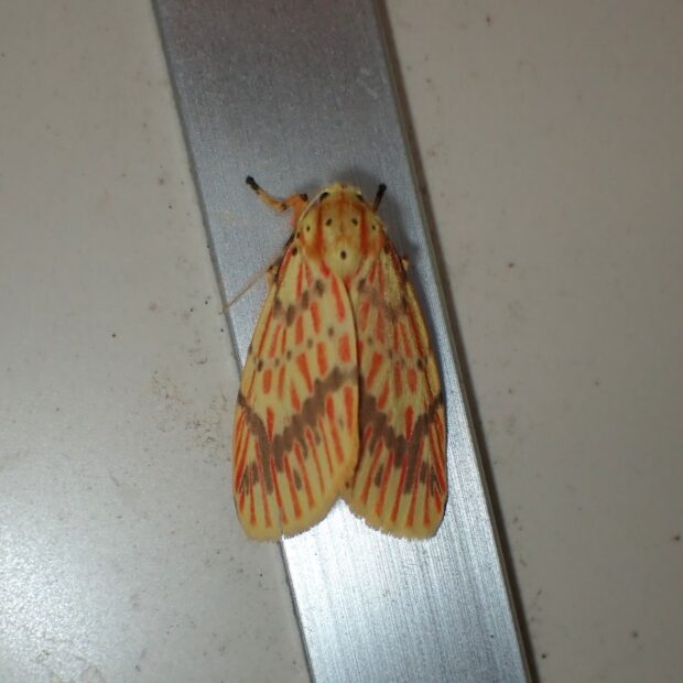 美しいコケガの仲間。 黄色っぽいはねに、 黒い点と赤い線が特徴ですが、 赤い線がないものなど、 模様に変異が多く、 微妙な違いが見られます。 平地から山地まで普通に見られ、 明かりによくやってきます。