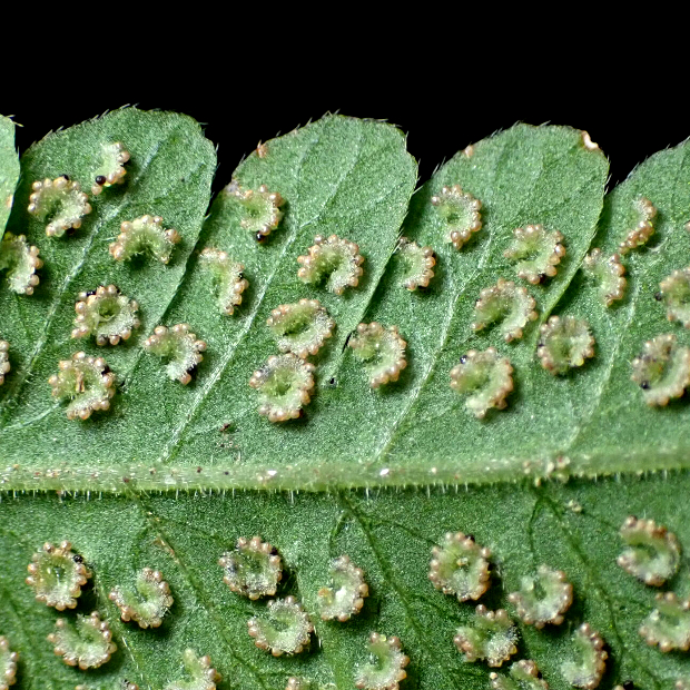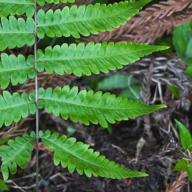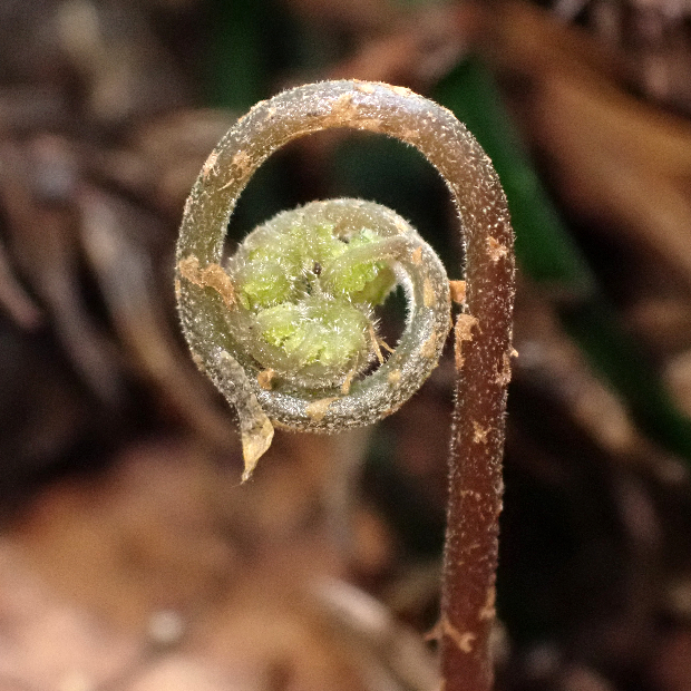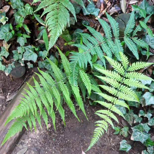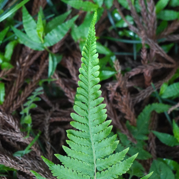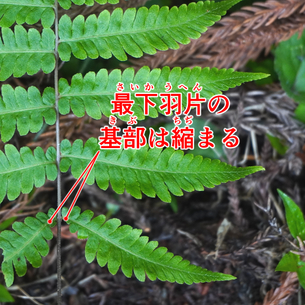 都市公園でもよく見られる身近なシダ。 葉はくすんだ緑色をしていて、 葉先が剣のように細く伸びます。 名前は葉がやわらかいことに由来しますが、 似たシダでやわらかいものはたくさんあるので種の区別にはなりません。