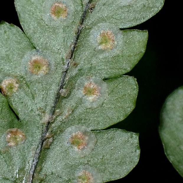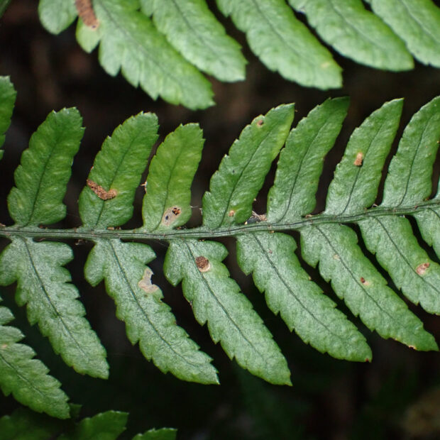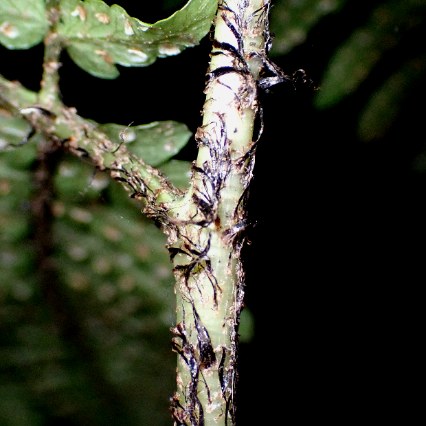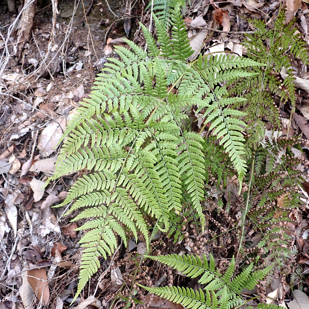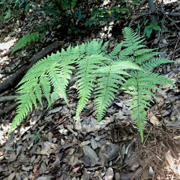 西日本に多いシダ。 全体的な見た目はオオイタチシダに似ています。 本種の葉は黄色っぽくて切れ込みは互いに重なり合う感じにつきます。 葉柄基部の鱗片はテカリが強い黒色で、 フチが薄い色をしていることも特徴です。
