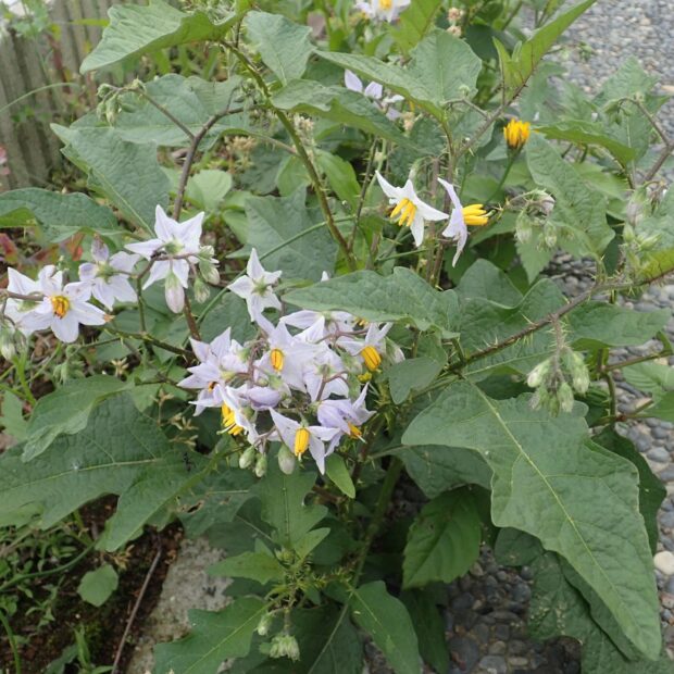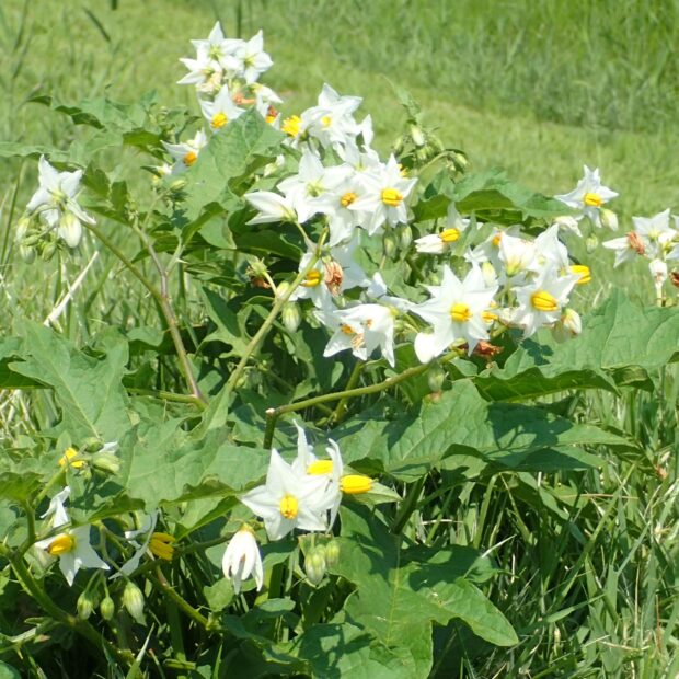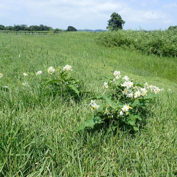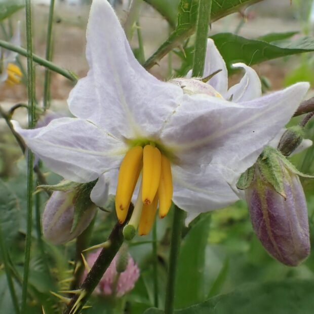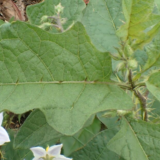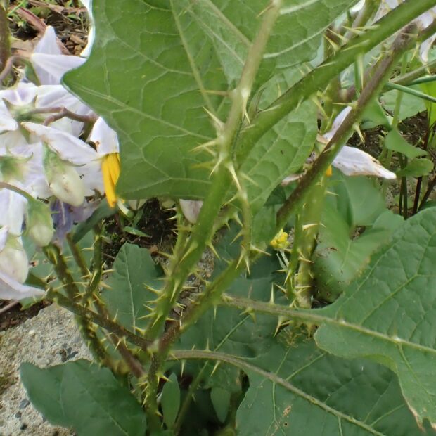 畑に栽培するナスに似ていますが茎や葉に鋭いとげが多く、 繁殖力も旺盛で、 畑の害草になるので悪茄子(ワルナスビ)と名がつきました。 日本には明治時代に牧草に混じって侵入したと言われています。 ナスやトマト、 ジャガイモなどナス科作物に数多くの害虫や病原菌をもたらし、 また、 その毒性やとげによって家畜への被害もあるため、 要注意外来生物とされています。