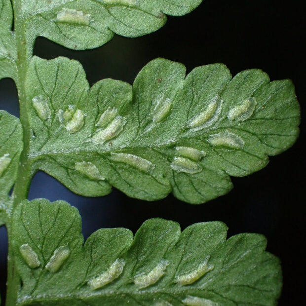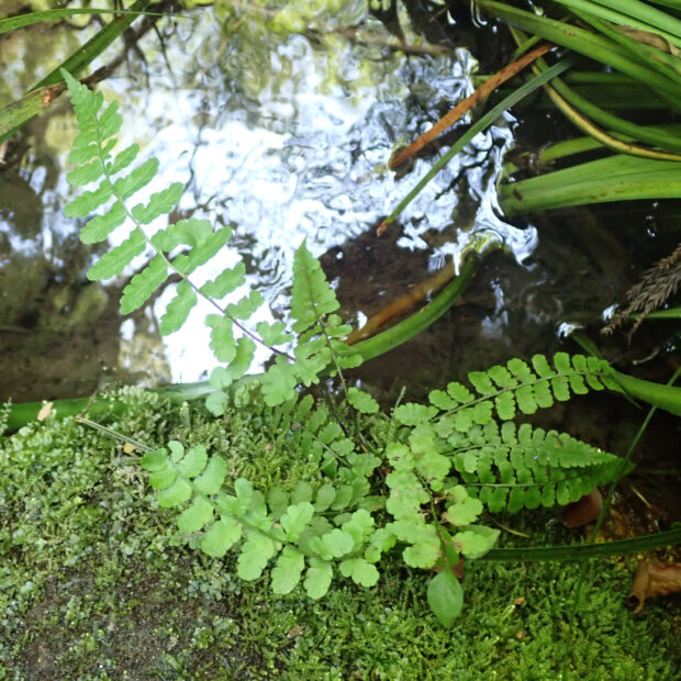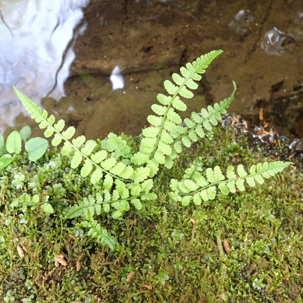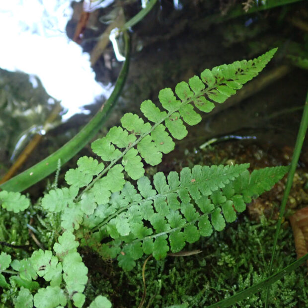 主に湿った場所に生える小さめのシダです。 フモトシケシダに似ていますが、 本種は葉がより細長く、 一番下の切れ込み(最下羽片)は普通あまり長く伸びません。 シケシダ類の例にもれず雑種をよく作ります。