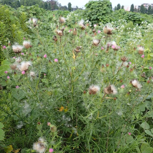 1960年代に北海道で確認され、 本州、 四国へと分布拡大しました。 北海道では利尻、 礼文など離島や知床などの自然公園内にも生育し、 対策がとられているそうです。 生態系に大きな影響を与える恐れがあり、 鋭いとげがあって危険、 大型に育ってたくさんの種子をつけ生育地を広げるということで、 要注意外来生物に指定されており、 駆除を呼びかける自治体も多くあります。