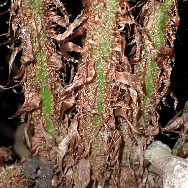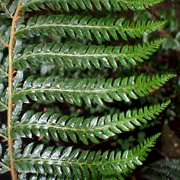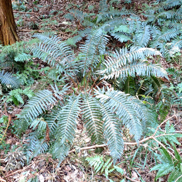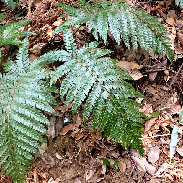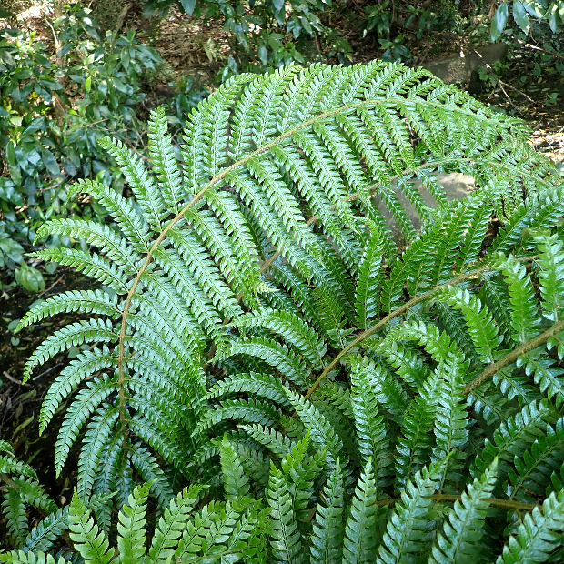 関東を代表するイノデの仲間のシダ。 大きな葉は光沢が強くて濃い緑色でとても迫力があります。 葉柄につく鱗片は細めでフチに突起がなく、 よくねじれることも大きな特徴です。 名前は東京都の飛鳥山に由来します。 日本固有種です。