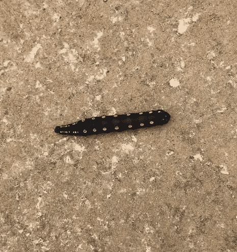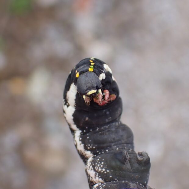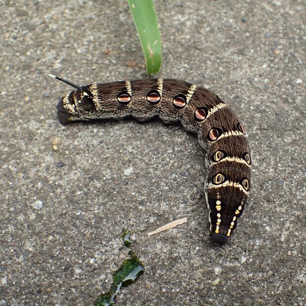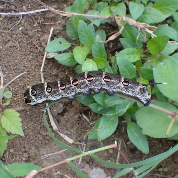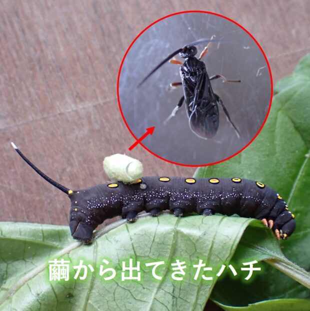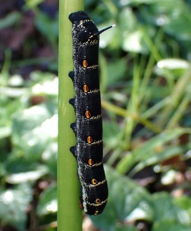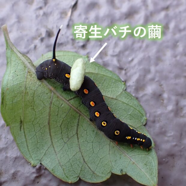 若齢幼虫。 黒い体に黄色い丸が並ぶ。